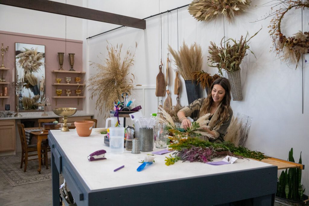 Design tables are placed in the middle of the store so that floral displays can be seen throughout their creation.