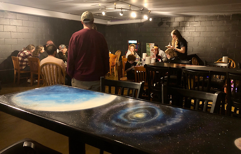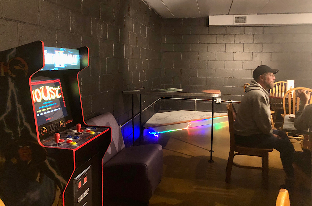 The lower level includes tables, a bar, small stage, board games and an arcade game, with more to come.