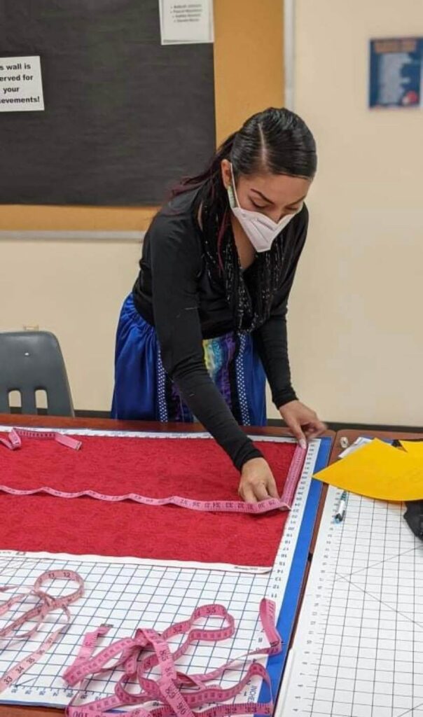 My most recent work has been with Joe Foss at Axtell Park, instructing students on how to make ribbon skirts. The length and subject of any residency I do will determine specific materials, project outcomes, meeting times and other variables.