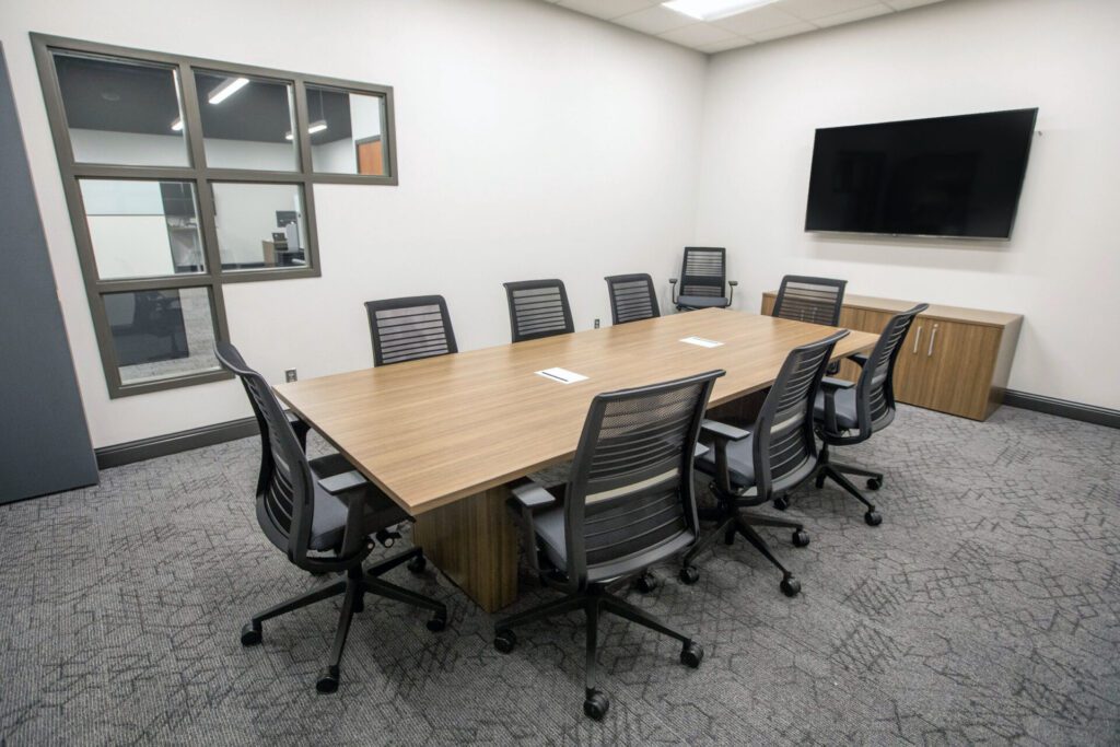 The meeting spaces include a main boardroom, where Kooima is working on fabricating a custom conference table, and a smaller conference room with a more traditional table and chairs.
