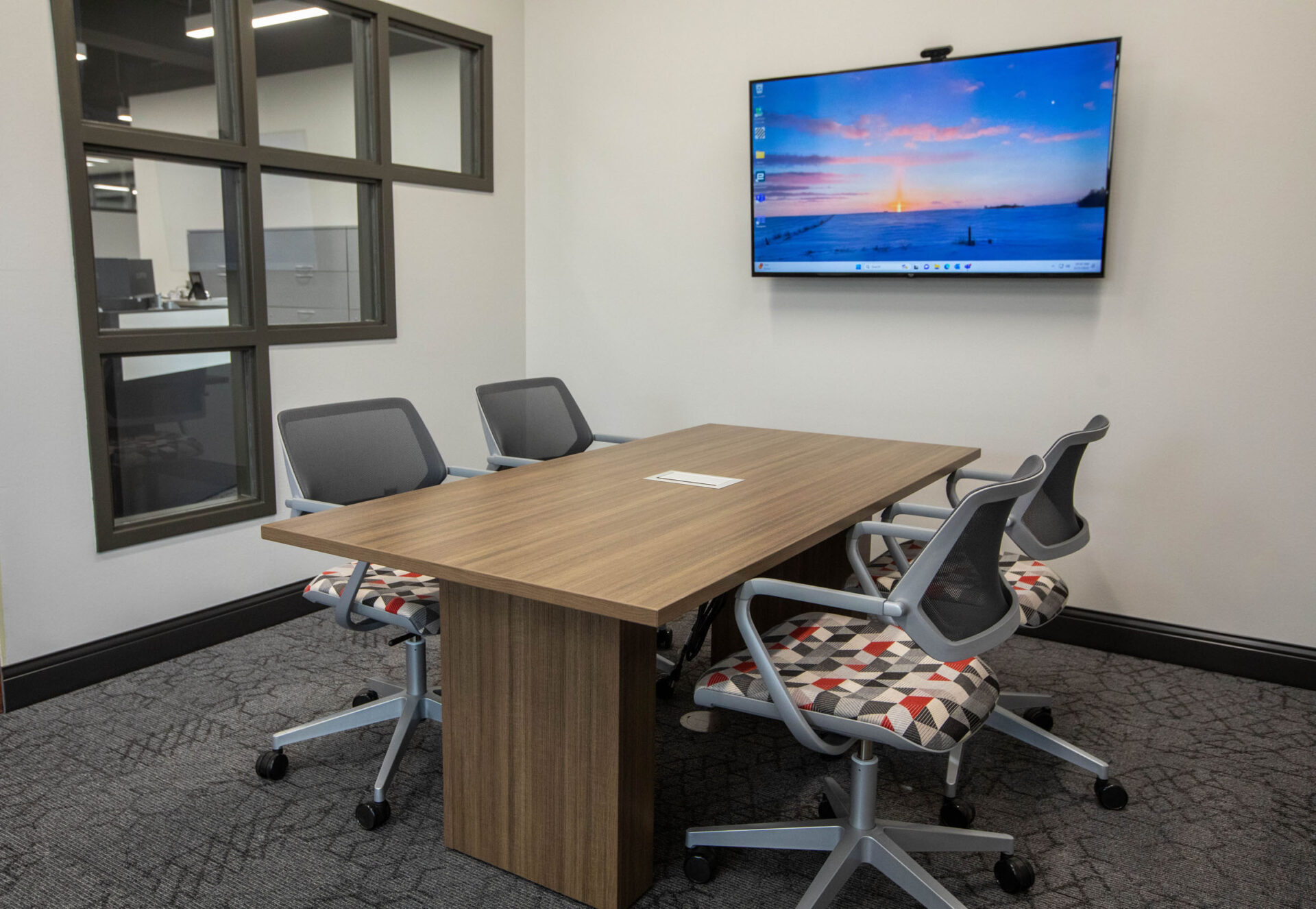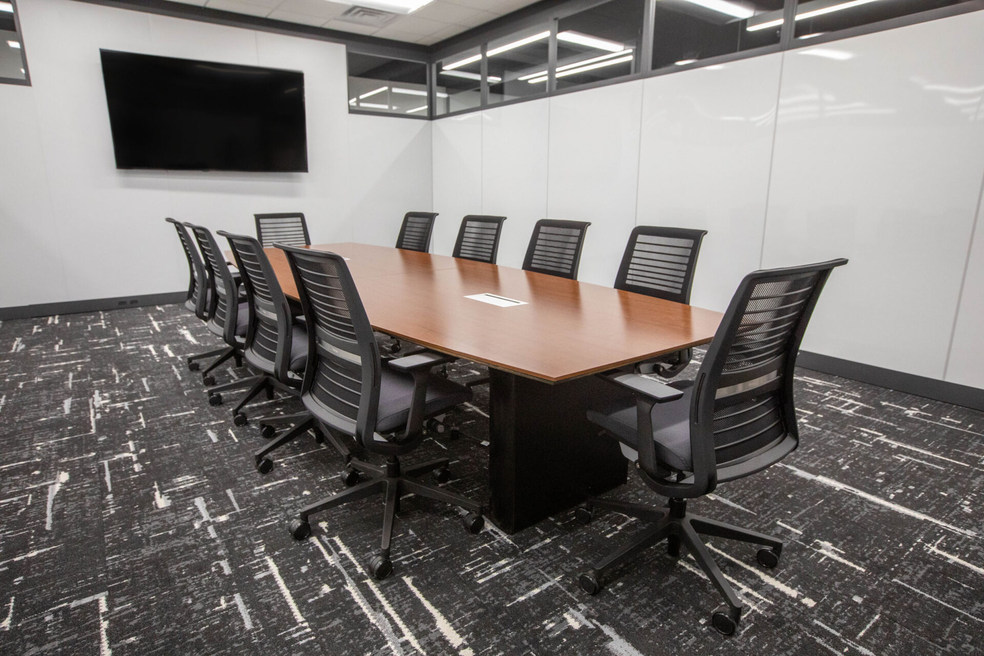 The meeting spaces include a main boardroom, where Kooima is working on fabricating a custom conference table, and a smaller conference room with a more traditional table and chairs.