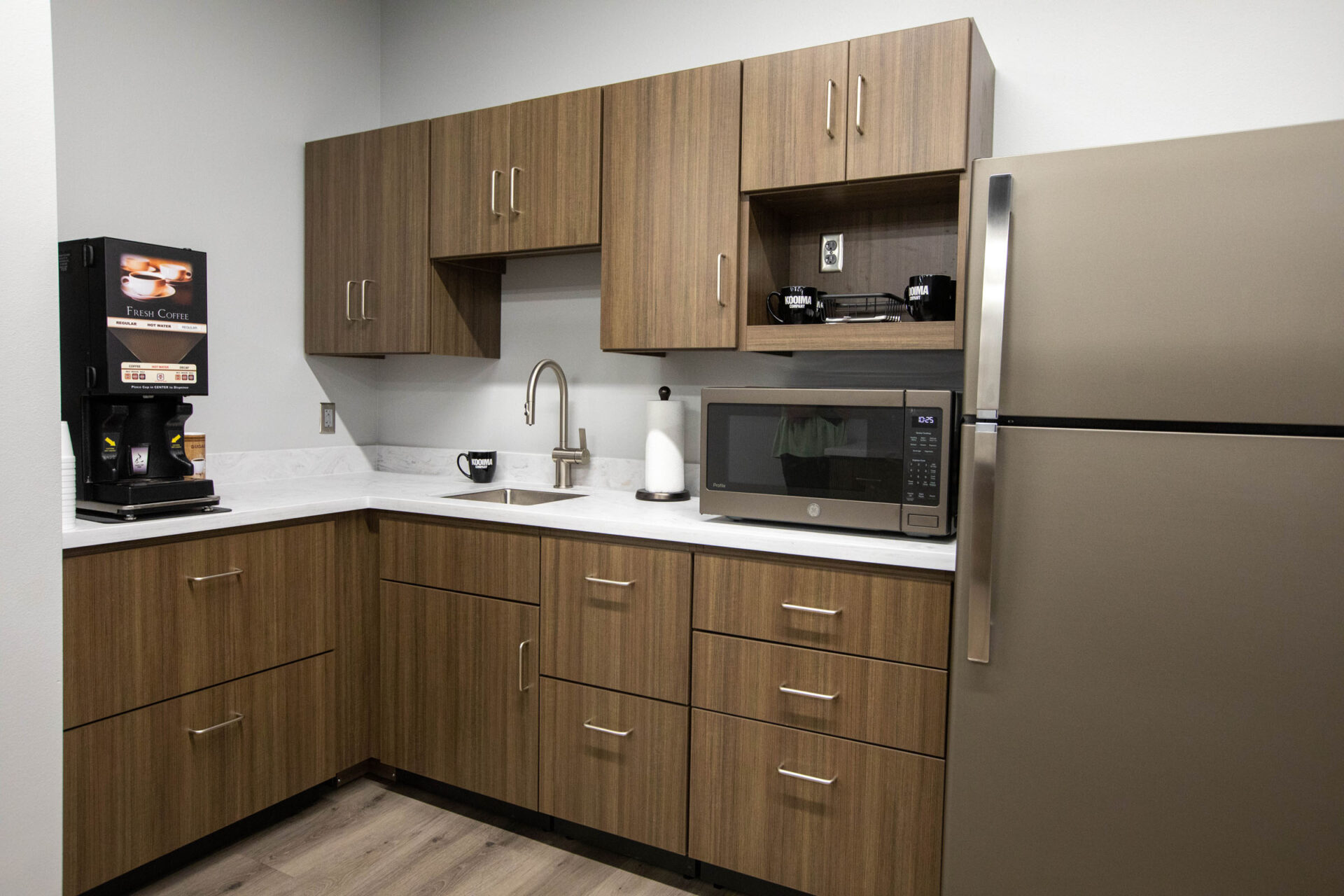“There are dividing pieces to segment the work groups, and we provided their kitchenette with a modular line from Steelcase, so that was a nice feature to tie into the rest of the finishes,” Young said.