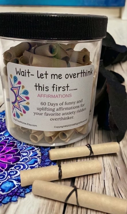 Blake does it through affirmation jars that she carries on her Etsy page, The Tired Nurse. Her affirmation jars contain 60 tiny scrolls. Each day, the recipient pulls out a scroll, unwraps it and reads a quote designed to uplift, inspire and entertain.