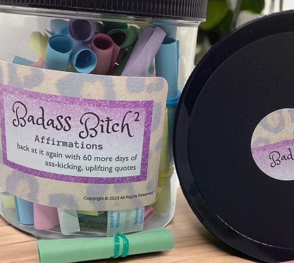 The jars have themes. Her bestselling affirmation jar, “Badass Bitch,” is designed for women, while another jar is aimed at men. Her fifth bestselling affirmation jar is aimed at people going through sobriety; Blake wishes those jars would sell better and help people on that path. Other jars deal with grief and workplace issues.