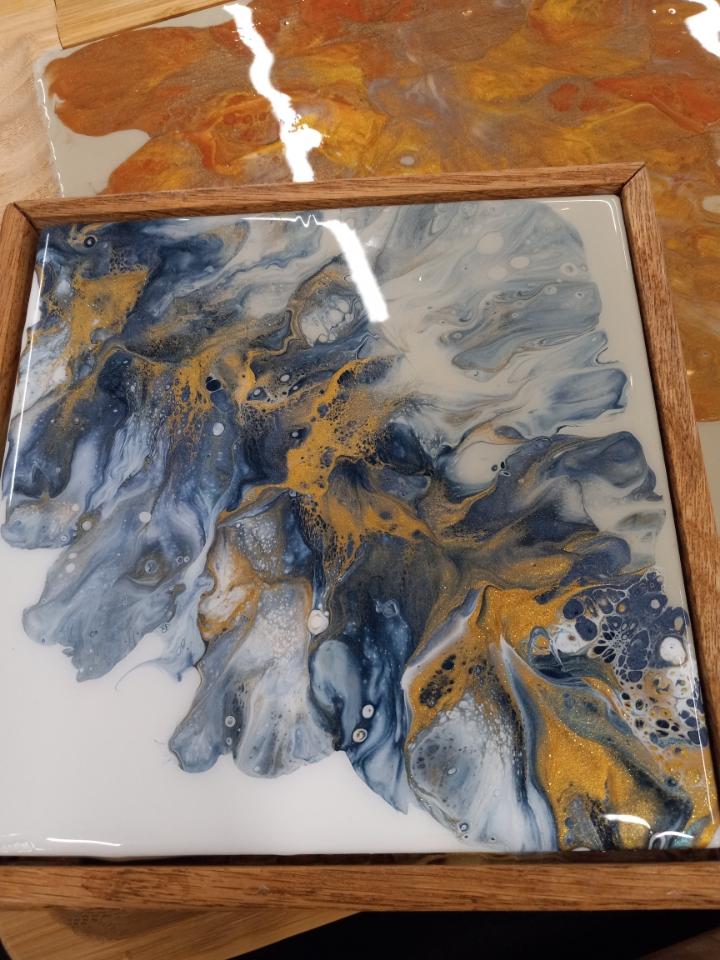 Petersen uses high-quality products to ensure a product that lasts, she said. Each piece takes about a week from start to finish. After she paints a tile, it must dry and the paint must cure. Then, Petersen does the prep work, sanding down the back and taping it to protect it from the resin she pours over it. That takes three days to dry.