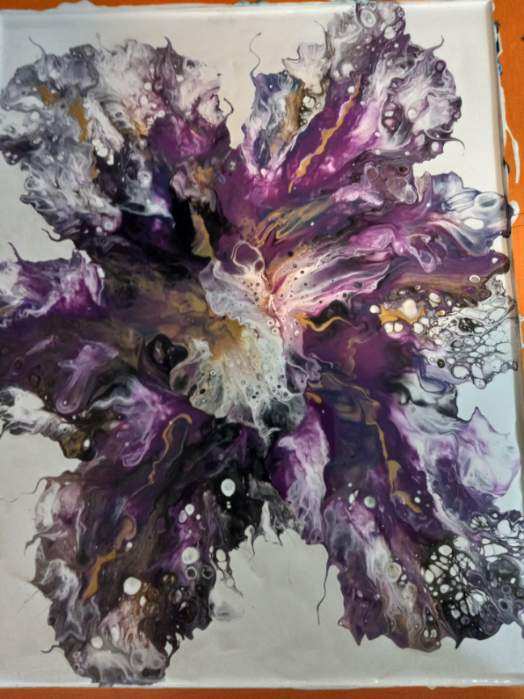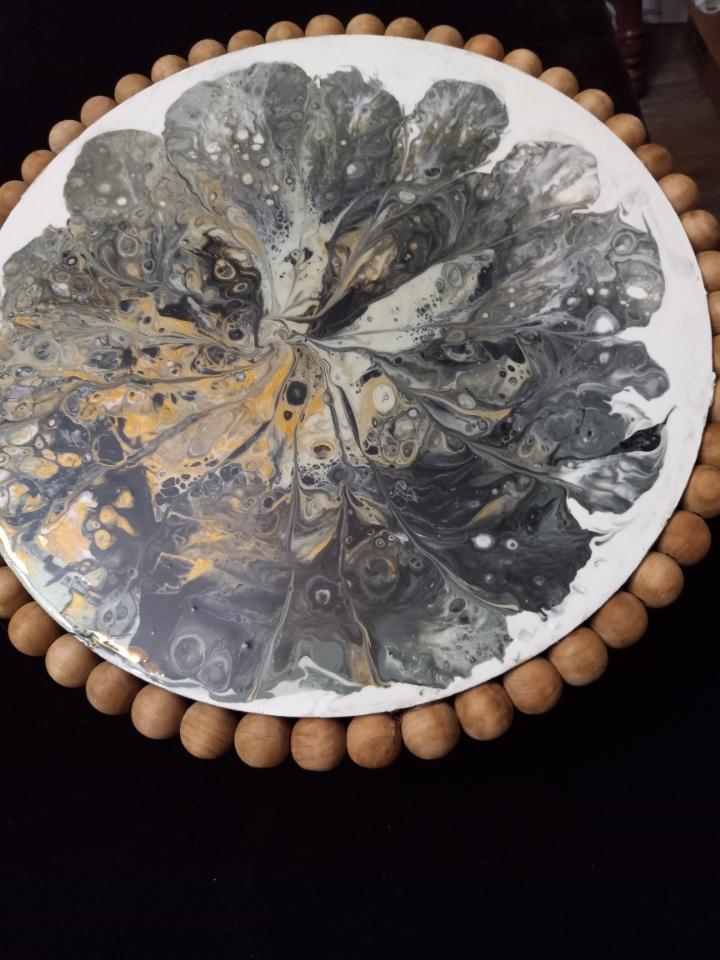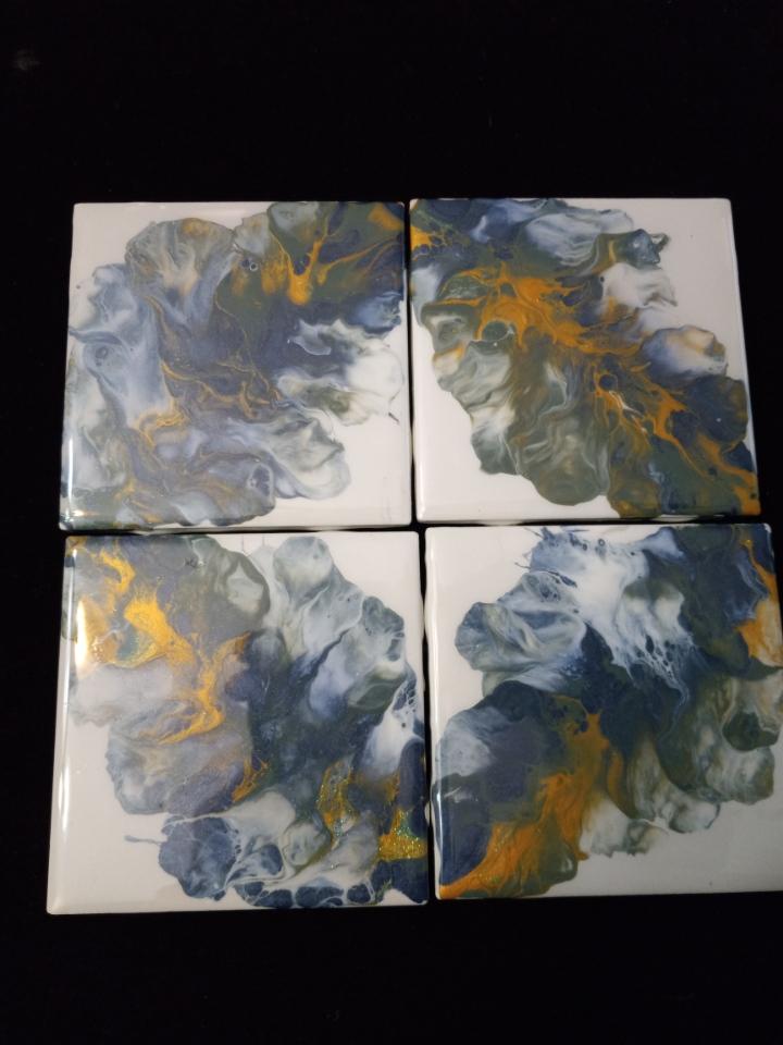Petersen left those coasters on the shelf, but when she returned home, she started watching “hours and hours and hours of YouTube videos on paint pouring and the ways they do this.” Some techniques used blow-dryers, but that wouldn’t work on porcelain tiles, so Petersen began using assorted sizes of drinking straws.