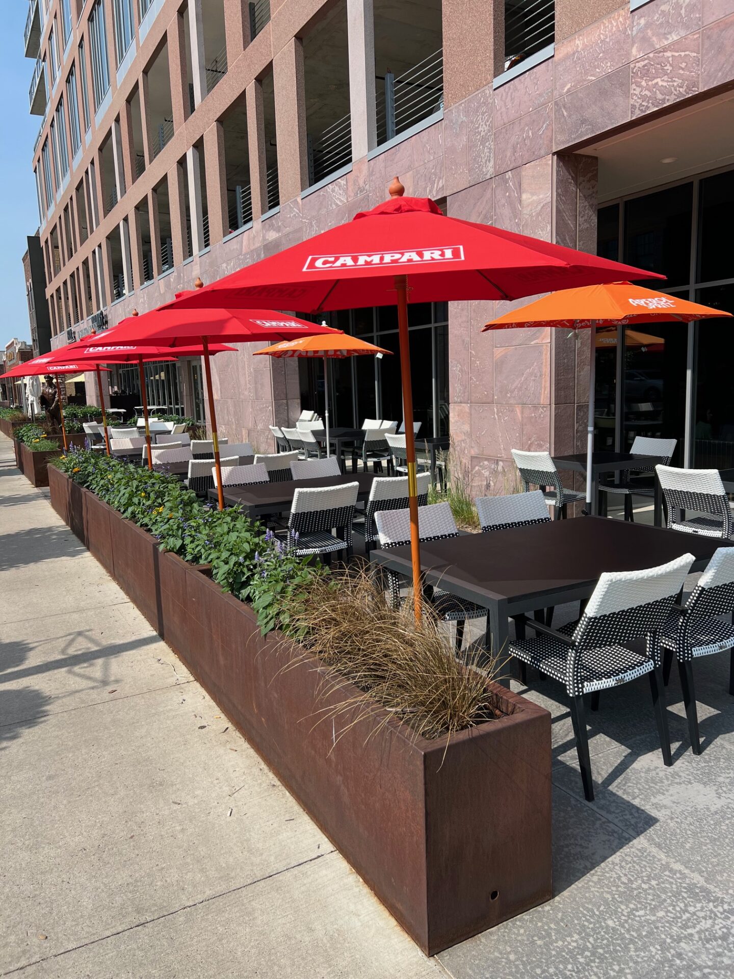 The patio’s tables and chairs were imported from Italy, and most of them seat four people, with total patio capacity at 45. Red and orange umbrellas provide shade for the west-side patio until the sun sinks behind the Washington Pavilion across the street.