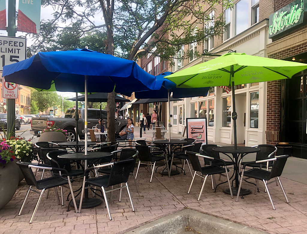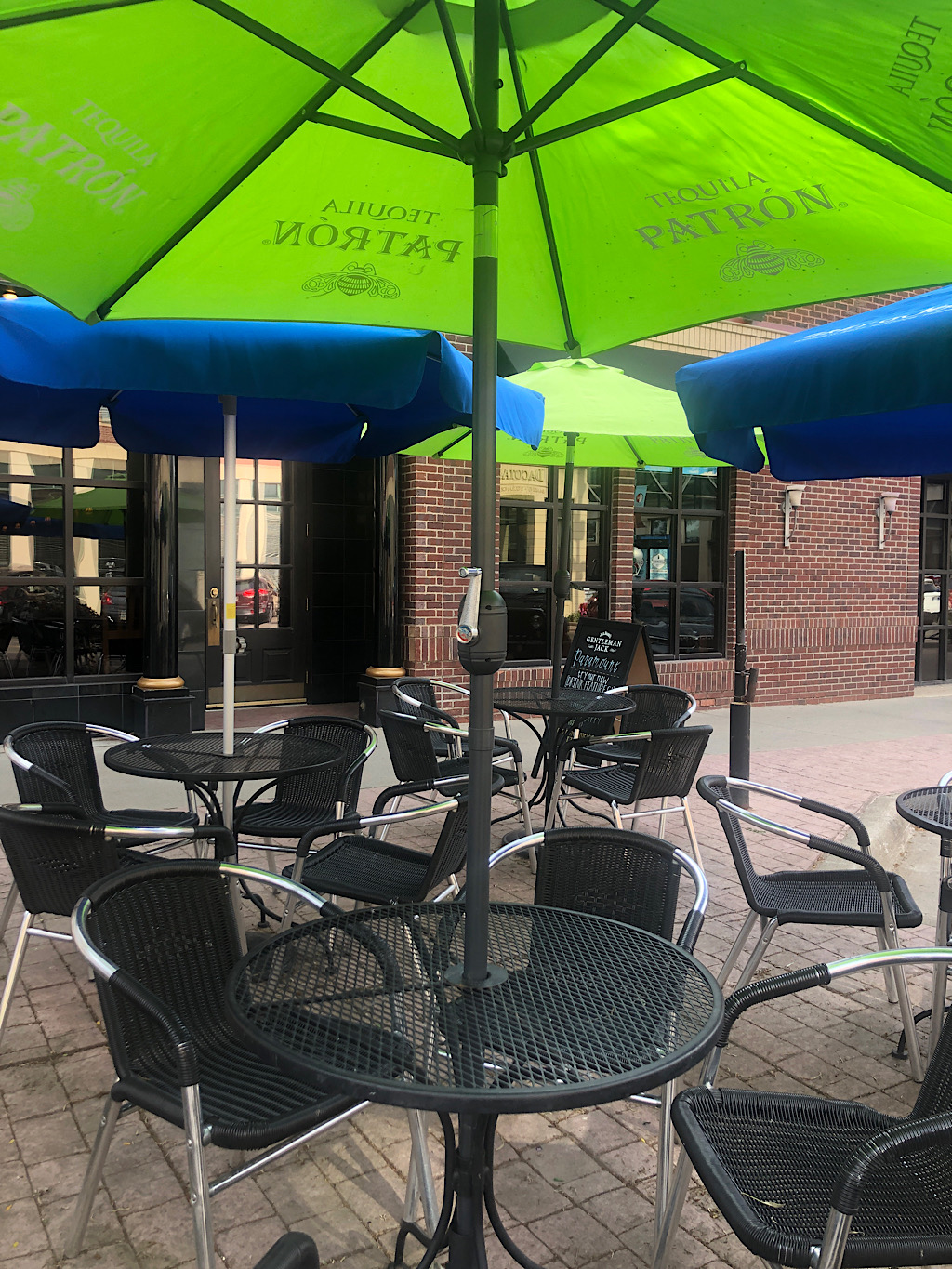 The lounge from neighboring Minervas closed in the spring of 2020 as the pandemic began and reopened late last year. The east-facing patio offers seating for up to 16 customers at four tables sprouting two green and two blue umbrellas.