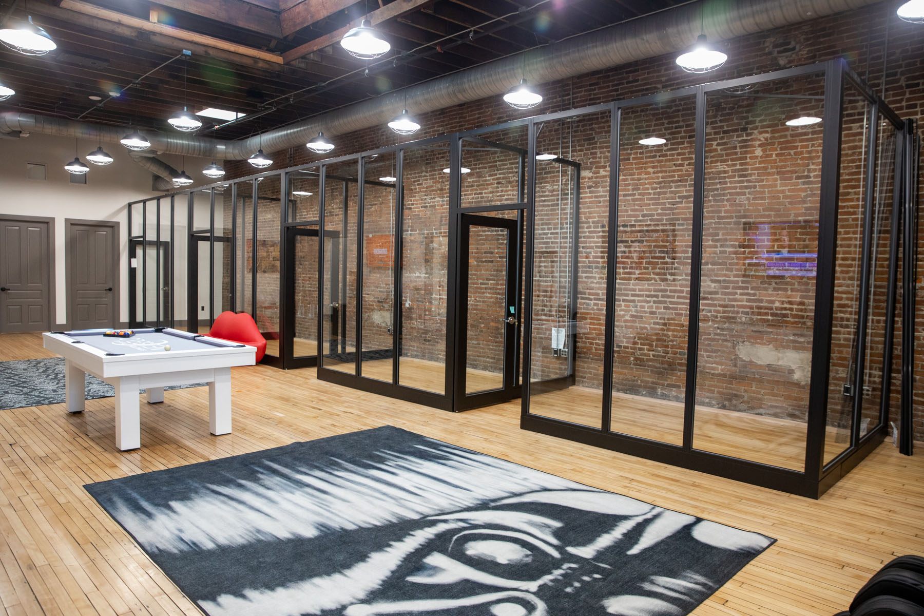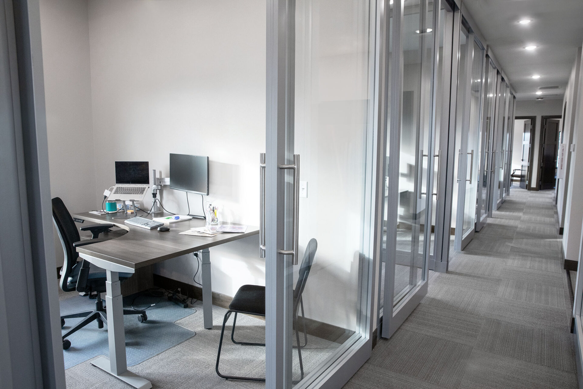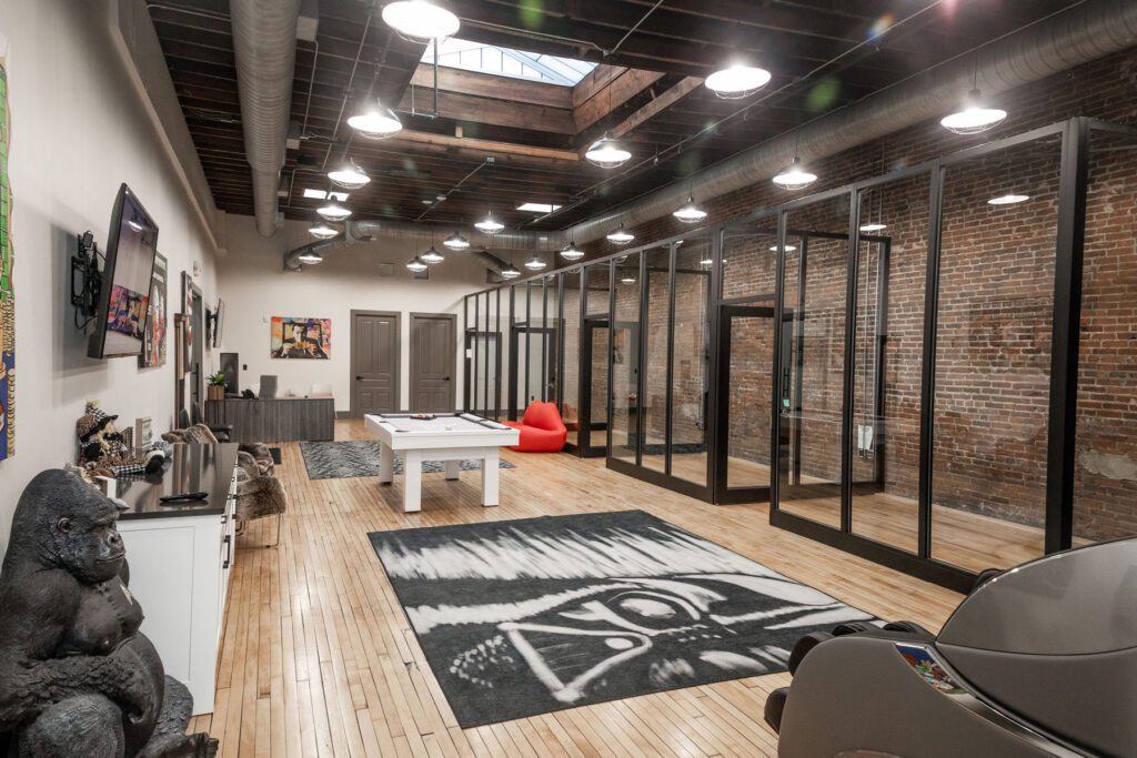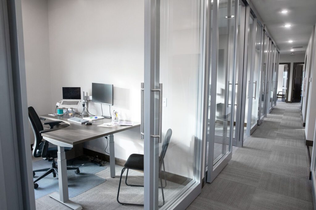 “He was very interested in the modular wall aspect and just really liked the look of it – all the glass and visibility was definitely something they didn’t have in the old space,” Young said. “It was very closed off. These offices are small, but narrow, with a glass wall on one side, so they can have a sense of seeing other people and chatting back and forth even though there’s a wall between them. They have really high 10-foot ceilings, so the walls are floor-to-ceiling full glass that creates a really interesting look when you walk down the hall.”