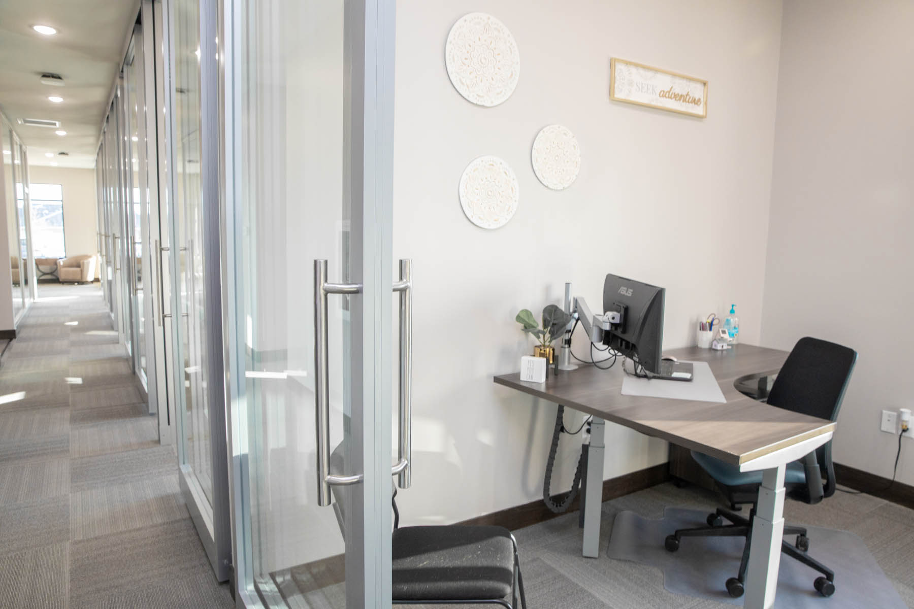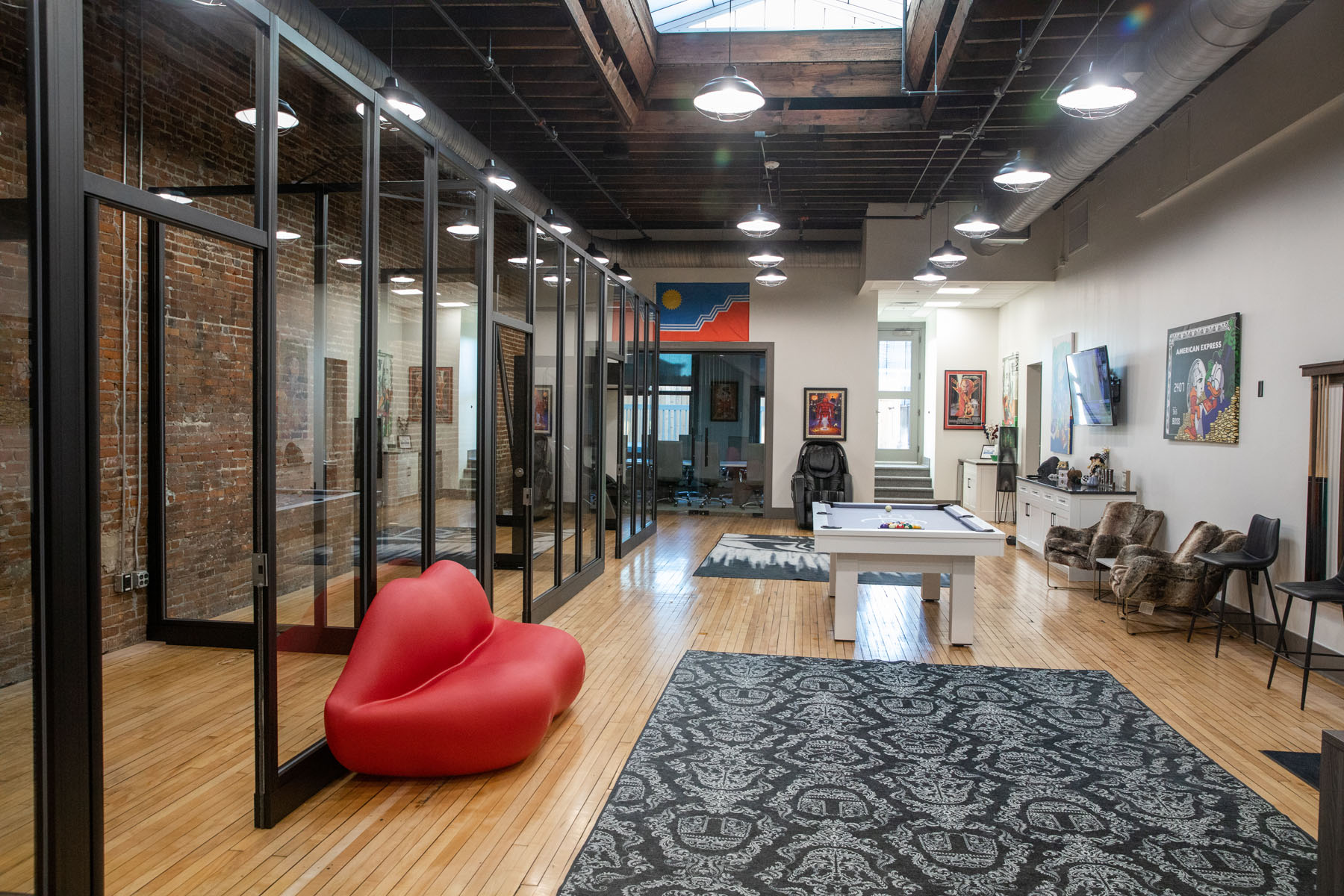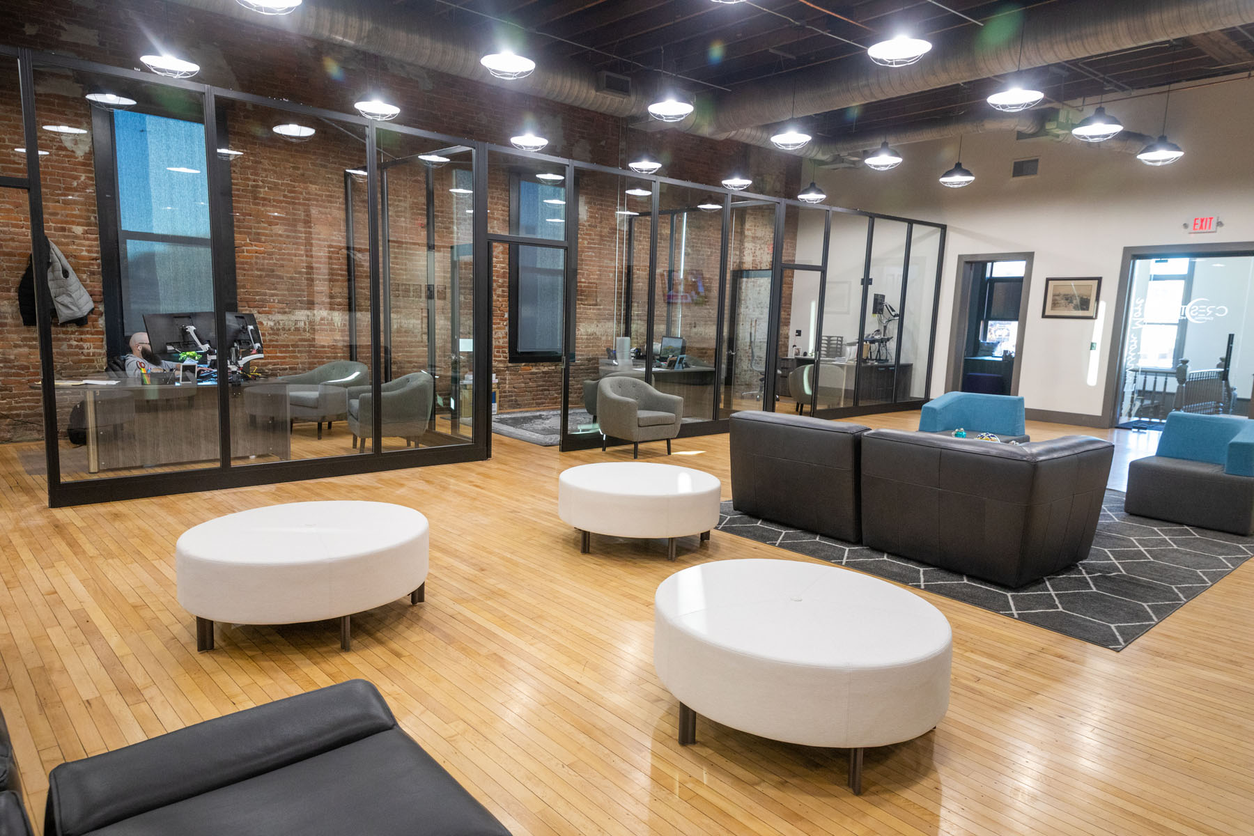 “He was very interested in the modular wall aspect and just really liked the look of it – all the glass and visibility was definitely something they didn’t have in the old space,” Young said. “It was very closed off. These offices are small, but narrow, with a glass wall on one side, so they can have a sense of seeing other people and chatting back and forth even though there’s a wall between them. They have really high 10-foot ceilings, so the walls are floor-to-ceiling full glass that creates a really interesting look when you walk down the hall.”