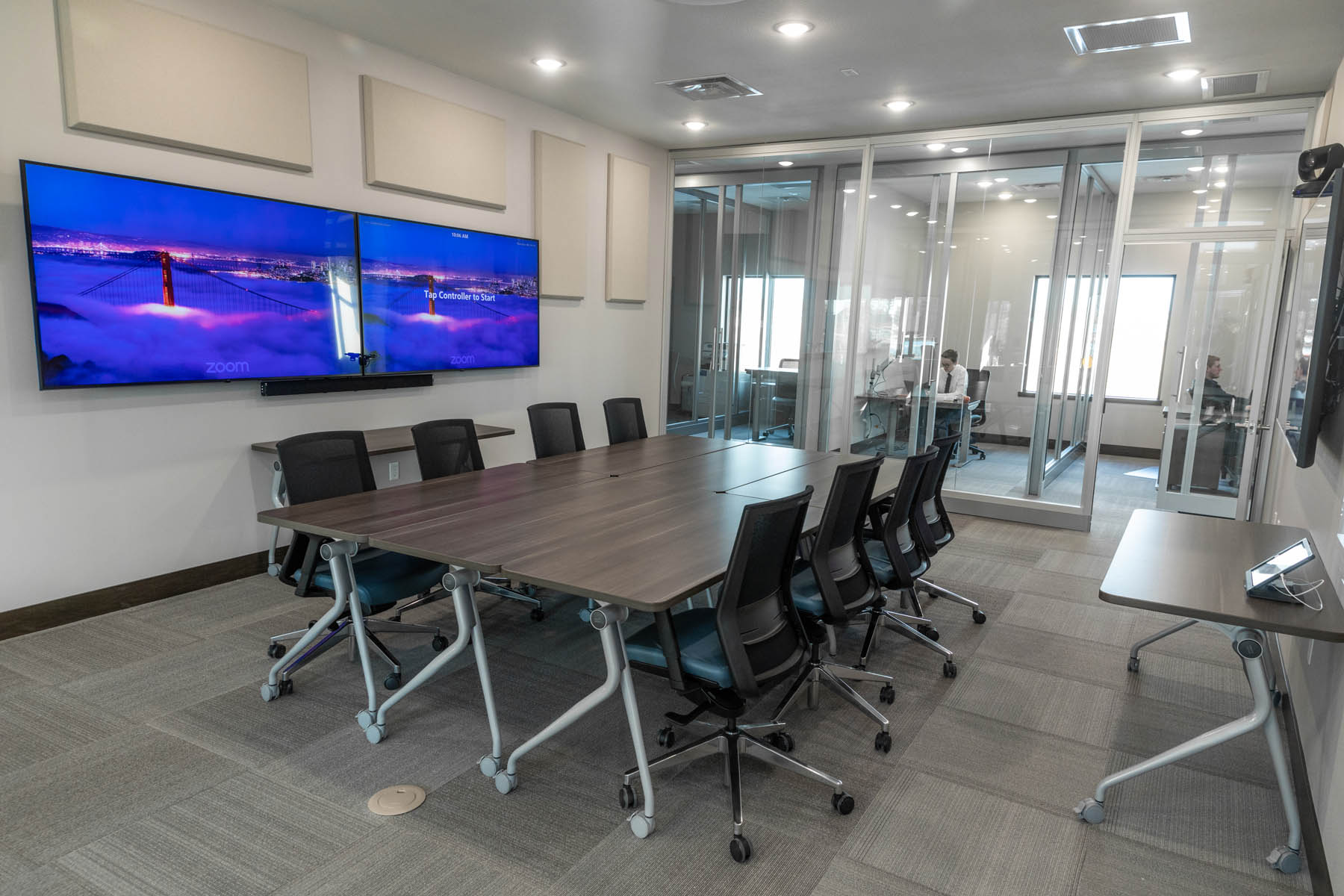 “In the conference rooms, we used that look as it’s very eye-catching,” Young said. “The slider doors have a glass polished edge, which eliminates framing around the door for a sleek look.”