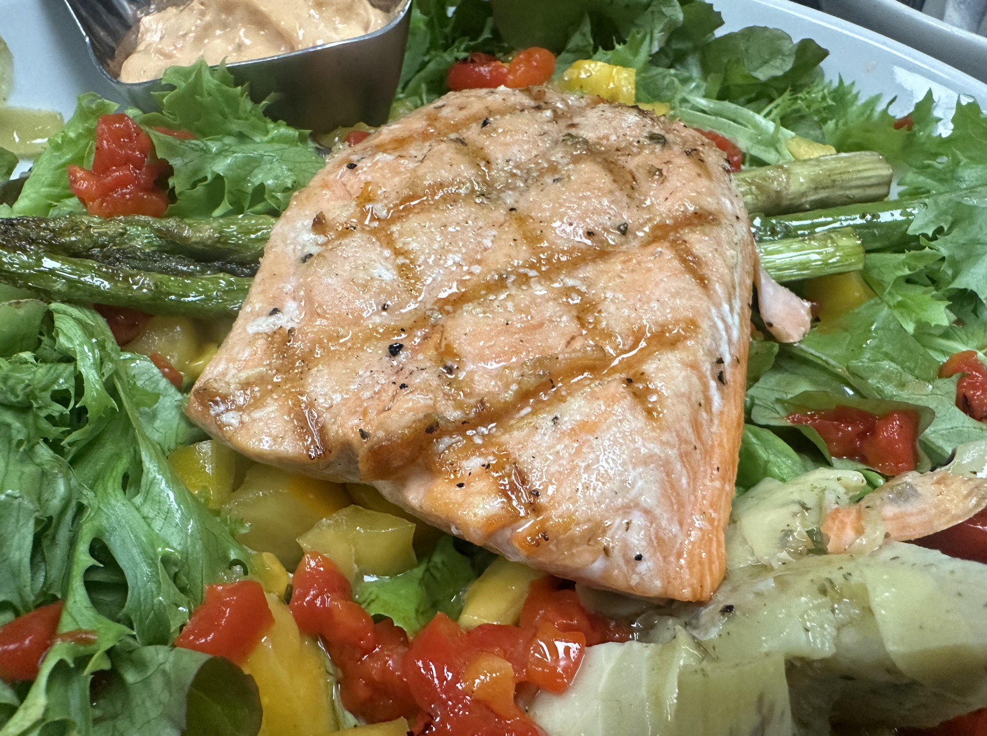 The salmon is being offered in Minervas signature dishes the Honey Pepper Salmon and Salmon Asparagus salad in addition to a new sandwich featuring smoked honey pepper salmon served chilled with aioli, capers, ribbon onions and baby gem lettuce.