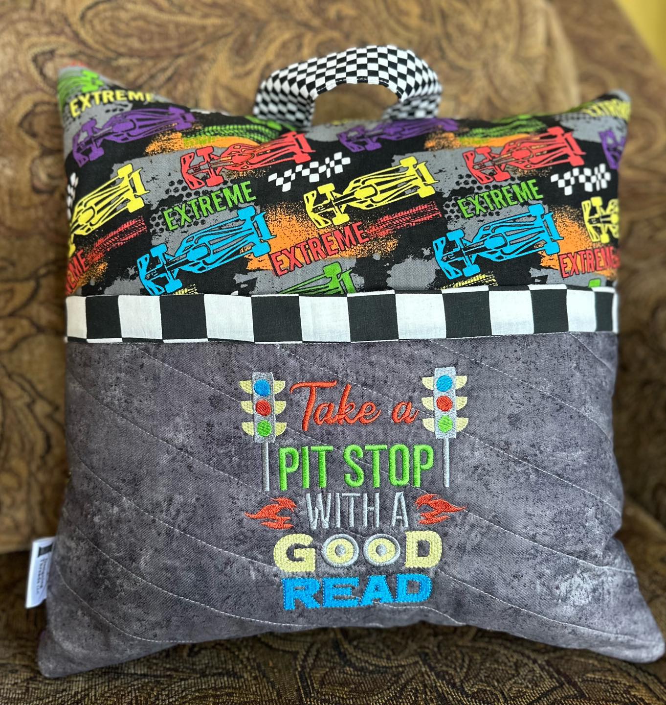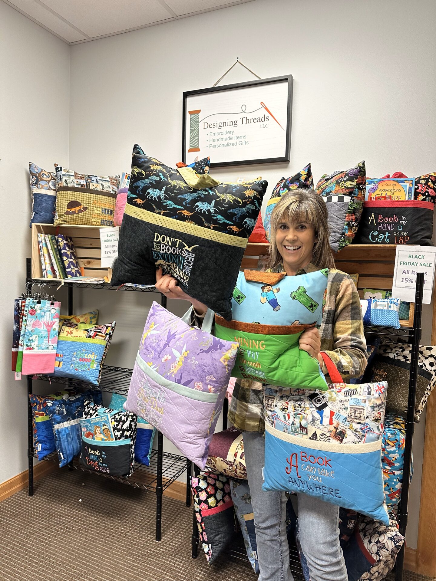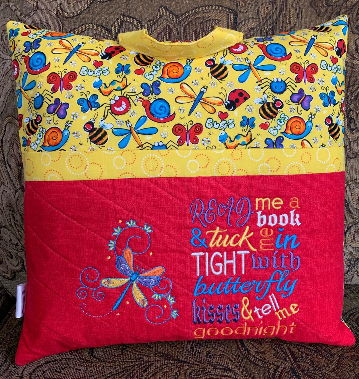 Her storybook pillows come in dozens of themes, each with an embroidered message that emphasizes the importance of — and the magical journeys that can come — with reading.