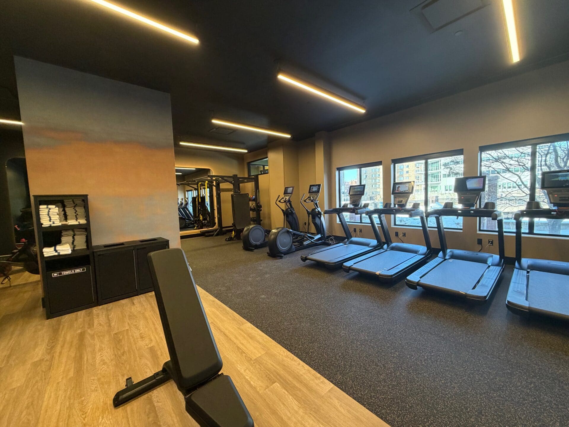 As the Starbucks shrunk, the adjacent fitness center grew by about 300 square feet, with additional treadmills, full-length mirrors and an enhanced weight-training area.