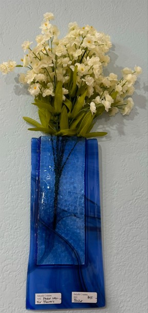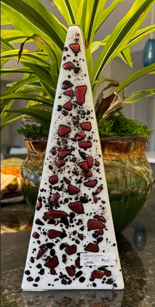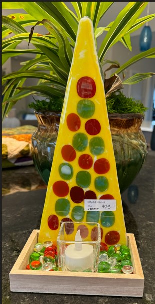 Stulc also learned that how she used her kiln for firing pottery differs markedly from fused glass. Cutting and grinding glass for a simple triangular Christmas tree takes about 30 minutes. For lawn stakes and other objects, she uses ground-up pieces of glass called frit that she lays into a mold. Depending on the program she runs, the pieces take 24 to 36 hours in the kiln.