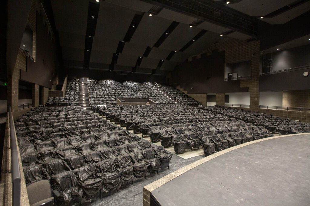 A black box theater also has a flat floor “and can be utilized in a variety of settings. In addition to providing space for students, you can have audience members surround them during performances for a more immersive experience,” Conrad said.