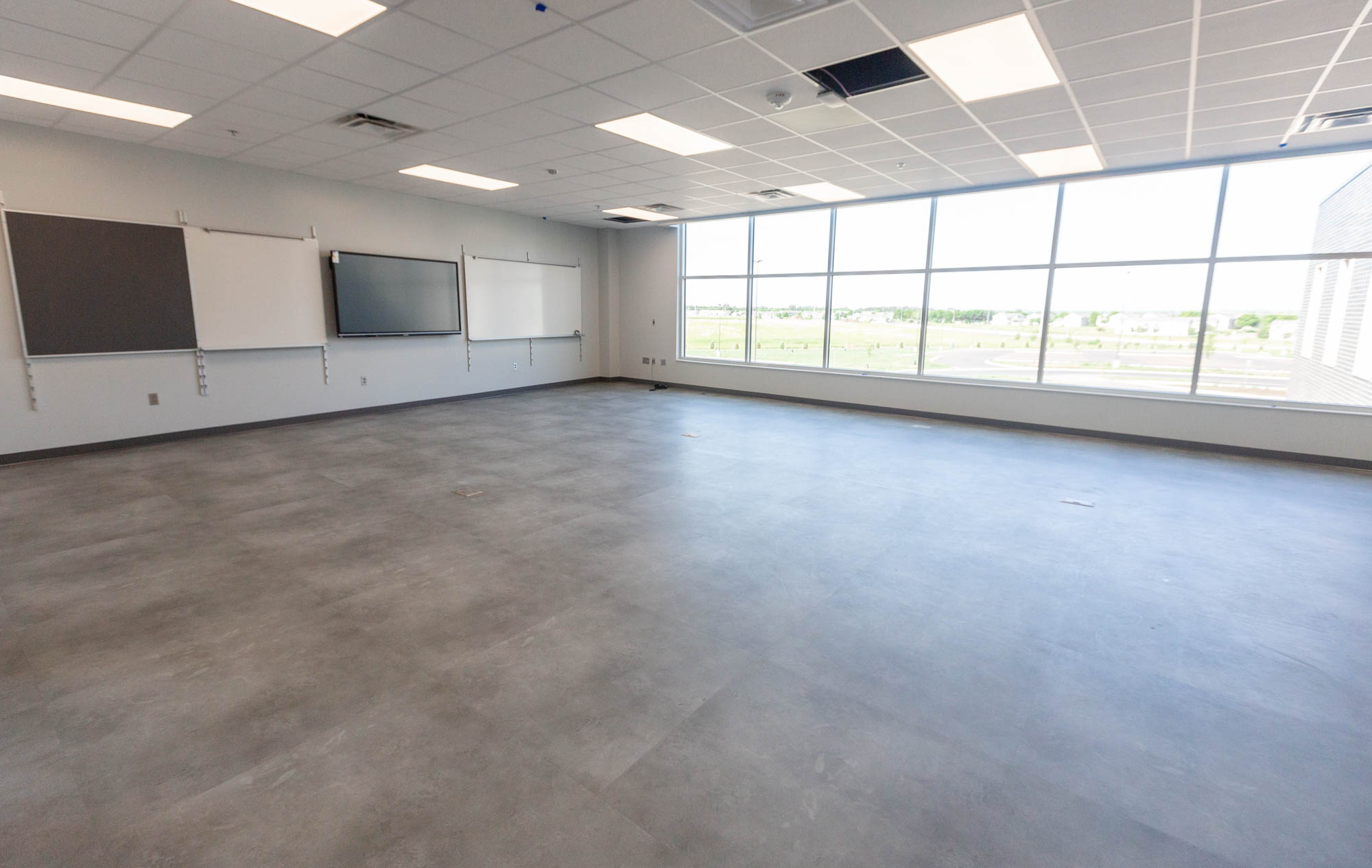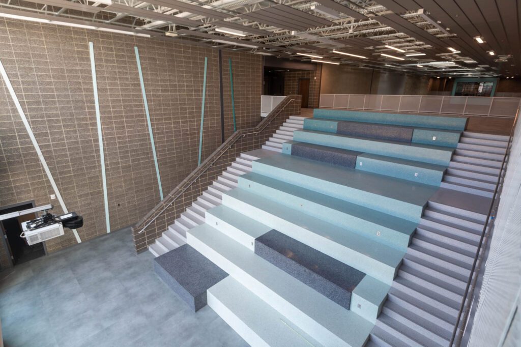 The music rooms lack the tiered seating of more traditional choir and instrumental practice areas and instead are designed as flexible flat floor space.