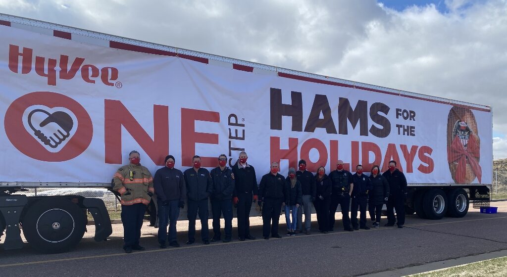 Hy-Vee employees and first responders gave away 300 Hormel Cure 81 hams to families in need as part of the One Step Hams for the Holidays campaign. The event March 24 at the W.H. Lyon Fairgrounds was one of 15 stops Hy-Vee made across eight states to deliver nearly 5,000 hams.