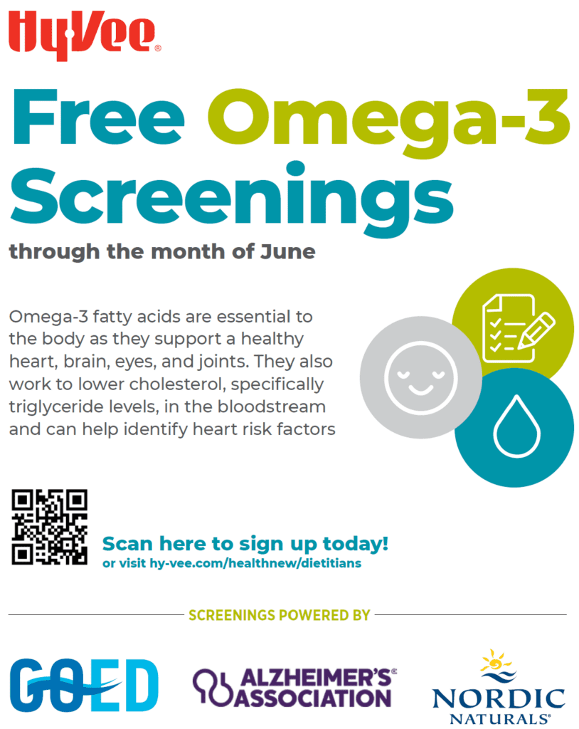Hy-Vee is providing 2,000 free omega-3 index screenings during June at select Hy-Vee stores throughout its eight-state region as a part of Alzheimer’s and Brain Awareness Month. Registration is required for the screening and can be completed online. The screenings, which are administered with a finger stick, are available while supplies last and are provided in partnership with GOED, Nordic Naturals and the Alzheimer’s Association. All locations in Sioux Falls are participating.