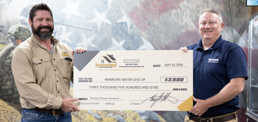 Ironclad Construction, a roofing and exterior remodeling contractor based in Beresford and serving southeastern South Dakota, northwest Iowa and northeast Nebraska, raised $3,500 for Warriors Never Give Up as part of its Roofing for a Cause campaign. The company donated a portion of every roof sold during March and April. The funds will help provide outdoor adventures for previously deployed or service-connected disabled veterans.