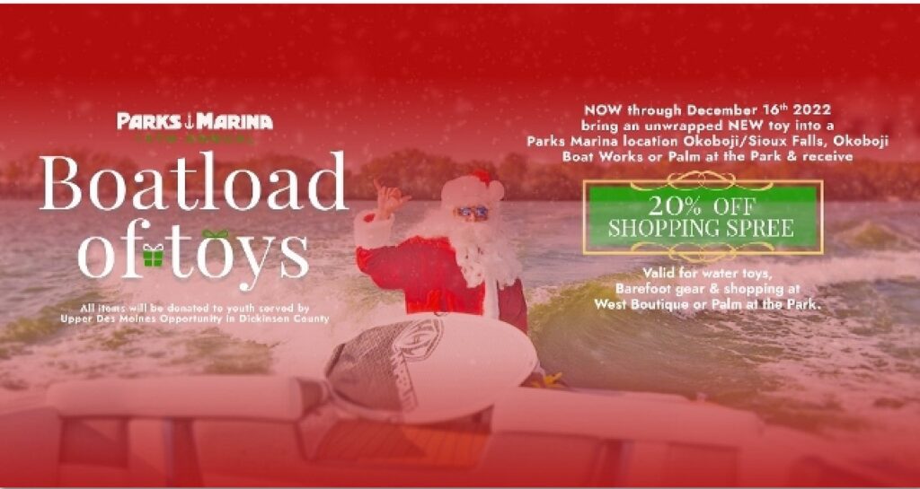 Parks Marina on East Lake in Okoboji, Iowa, is teaming up with Upper Des Moines Opportunity in Dickinson County as part of its annual Boatload of Toys fundraiser, happening now through Dec. 16. New unwrapped toys also can be dropped off at the boat dealership in Sioux Falls. Donors will receive 20 percent off Parks Marina water accessories, Barefoot apparel and shopping at West Boutique and Palm at the Park. Toys will be given to families in need.
