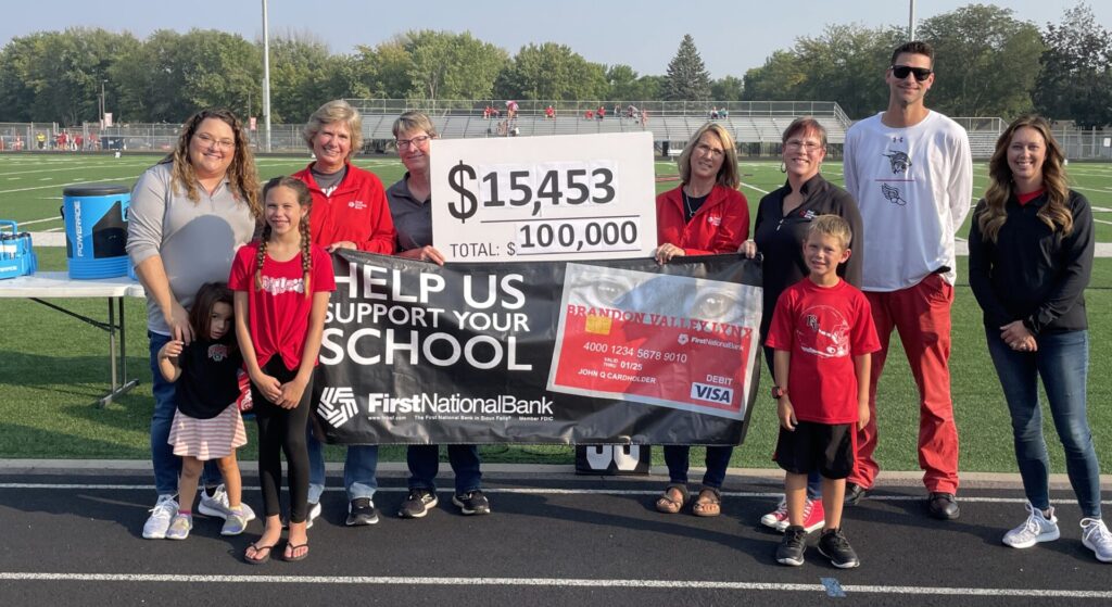 The First National Bank in Sioux Falls has presented the Brandon Valley School District with a $15,453 check as part of its Community Card program for schools. When a bank customer uses a Brandon Valley Community Card to make a credit purchase, a portion of that amount is donated to the school system. Brandon Valley was the first school to join the program in 2012, and this distribution brings their total Community Card earnings to $100,000.