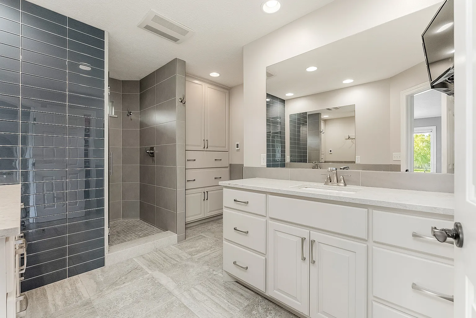 The primary suite features a bath with a tile walk-in shower, heated floors and enormous walk-in closet.