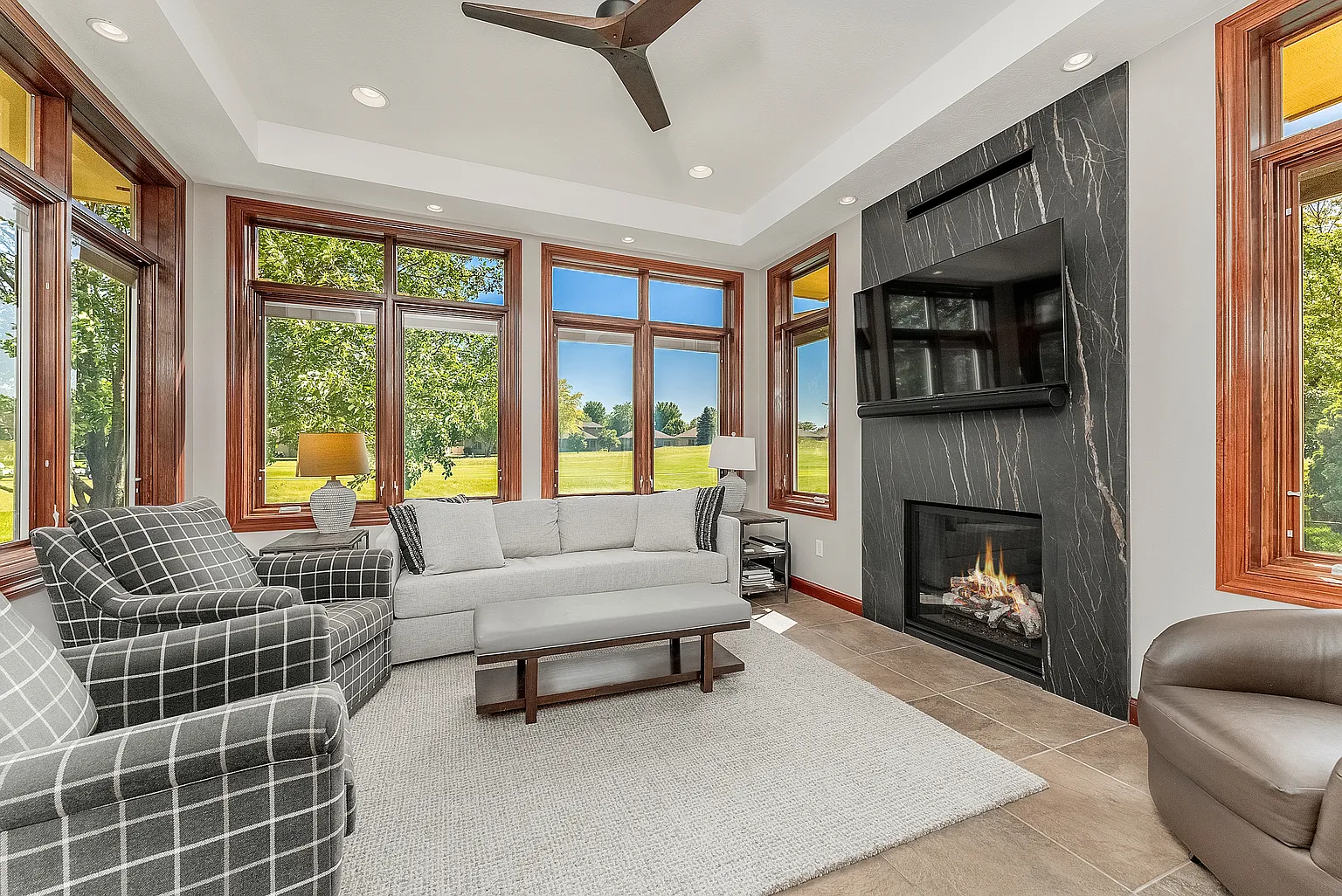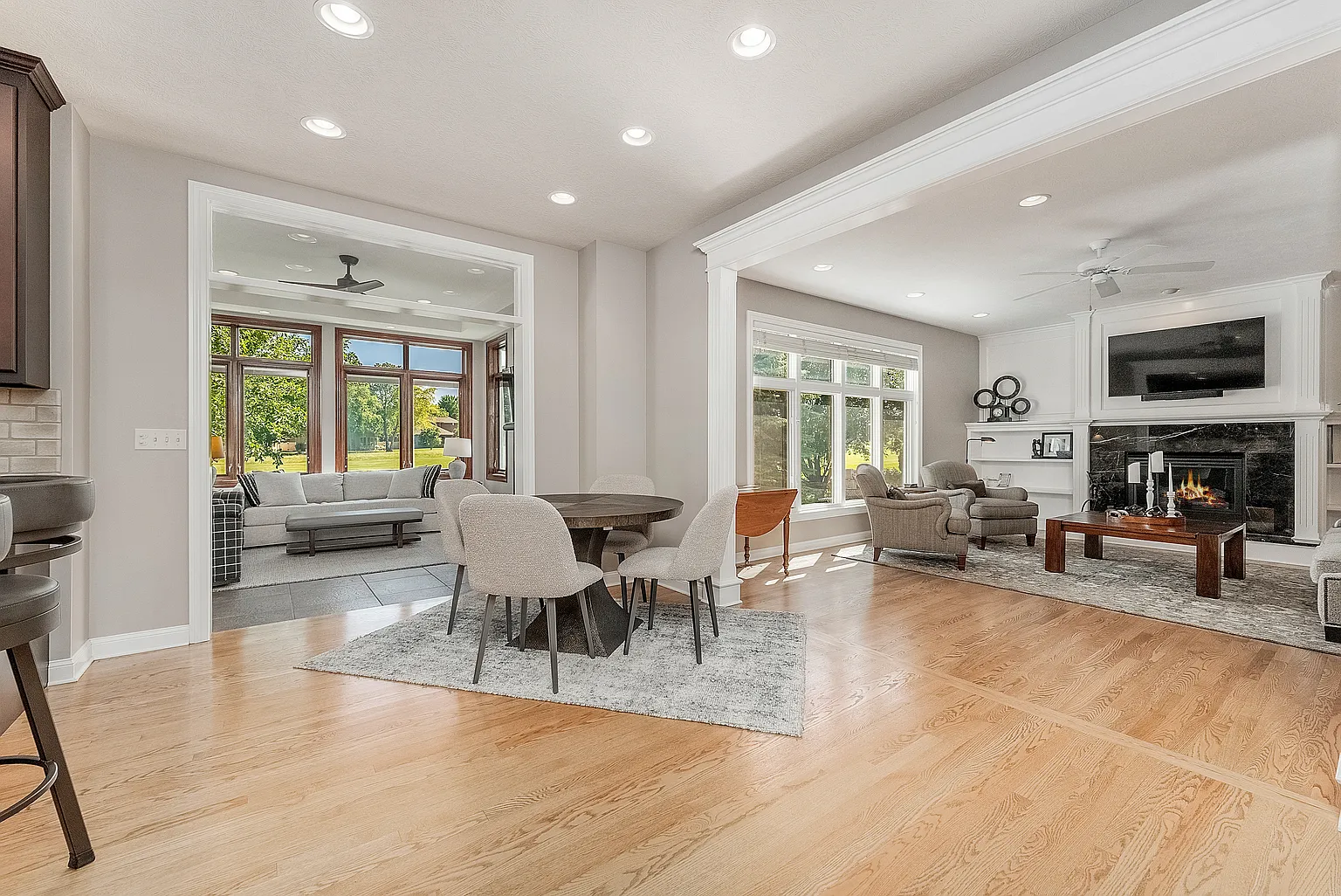 A gorgeous four-season room recently was renovated with updates, including a floor-to-ceiling stone fireplace.