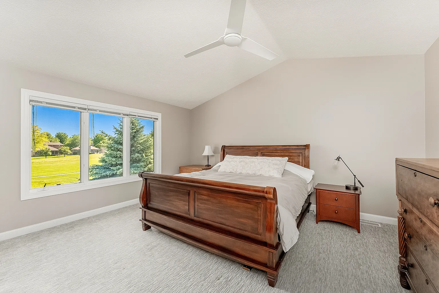 Large windows draw in natural light to the living space, while the kitchen offers abundant cabinetry, a wraparound island and a breakfast nook.