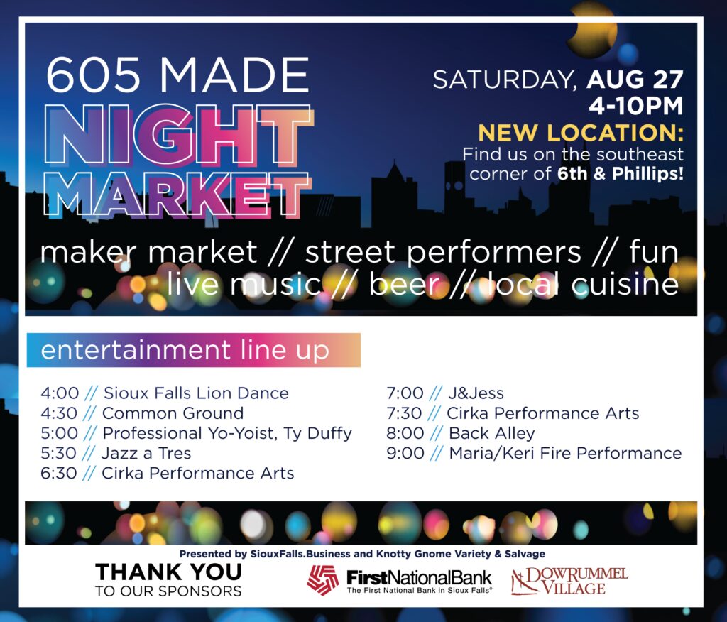 The 605 Made Night Market is organized by Knotty Gnome Variety & Salvage and SiouxFalls.Business and sponsored by The First National Bank of Sioux Falls and Dow Rummel Village.
