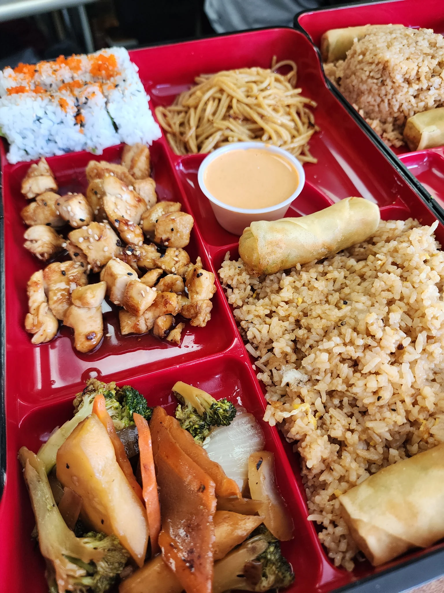 The bento boxes feature chicken, steak, shrimp, scallops or salmon with fried rice, noodles, vegetables, spring rolls, California roll, miso or onion soup and salad.