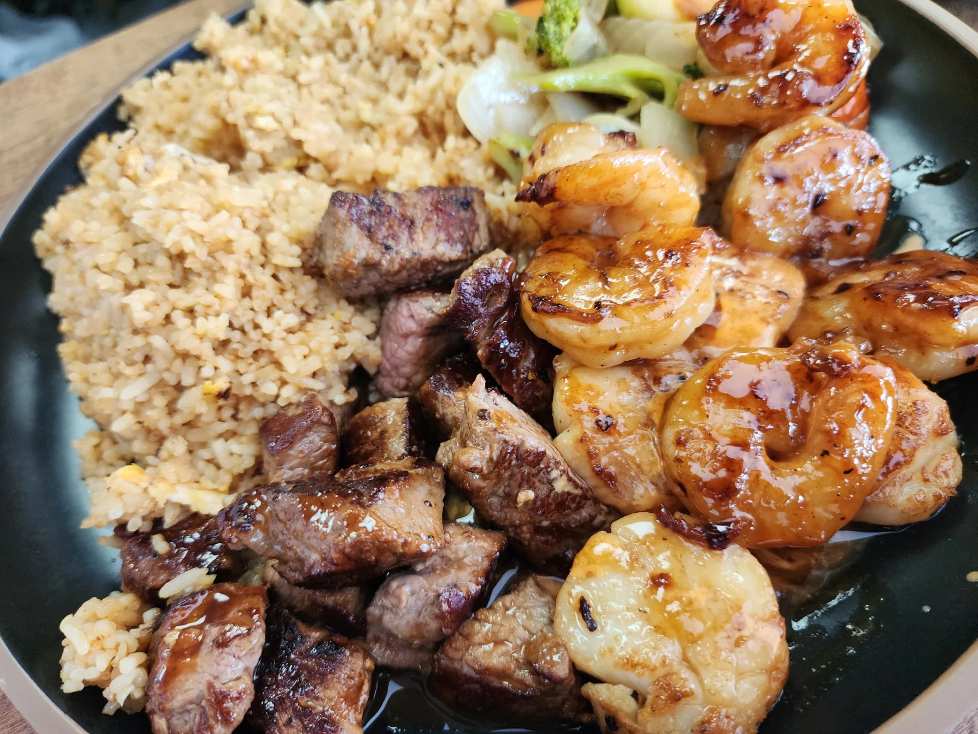 Hibachi entrees are served with fried rice or noodles, vegetables, soup and salad.