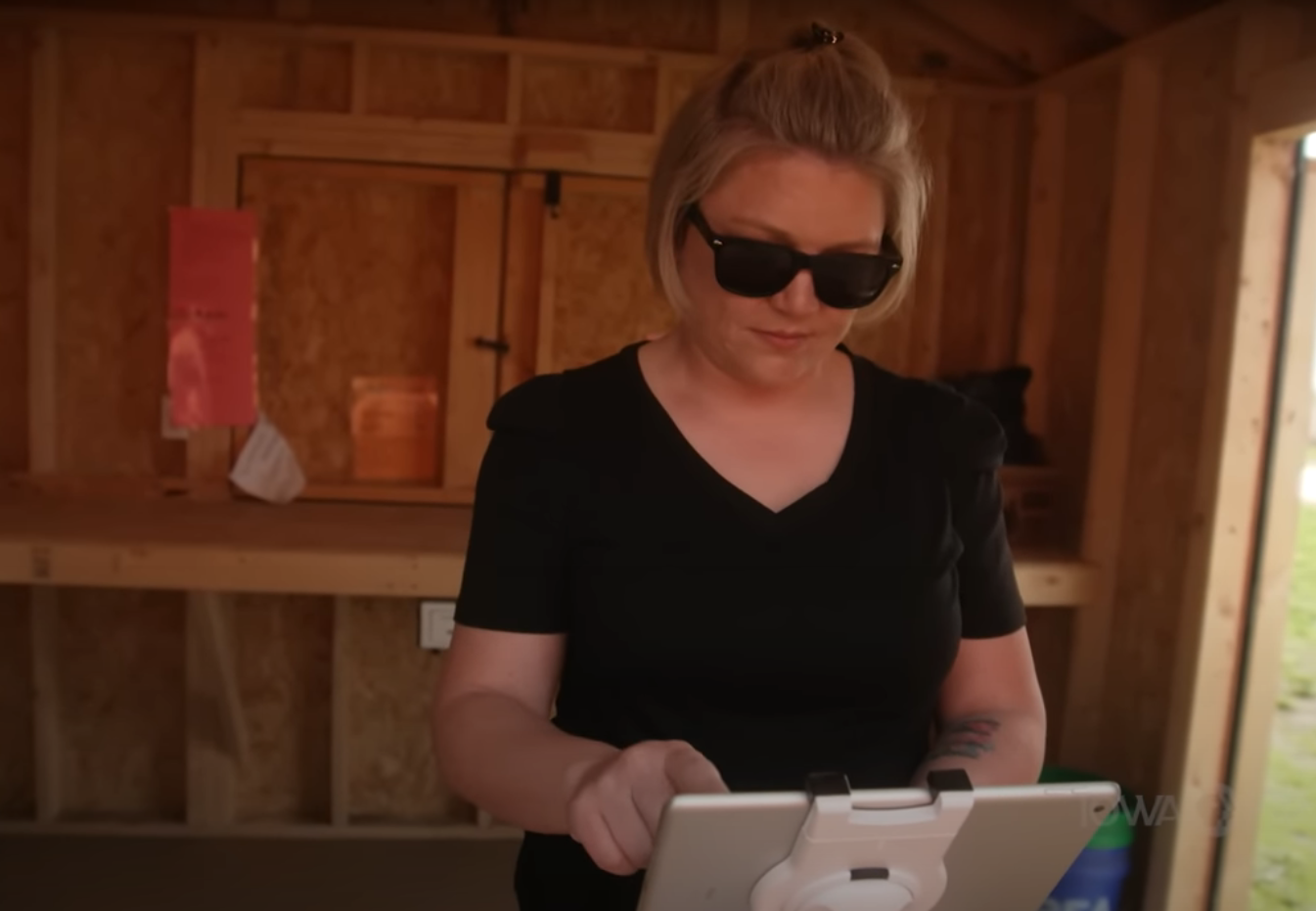 Emily Mueller operates a credit card reader at her Big Stone Pumpkin Patch business. Photo: Iowa Public Television/screen grab