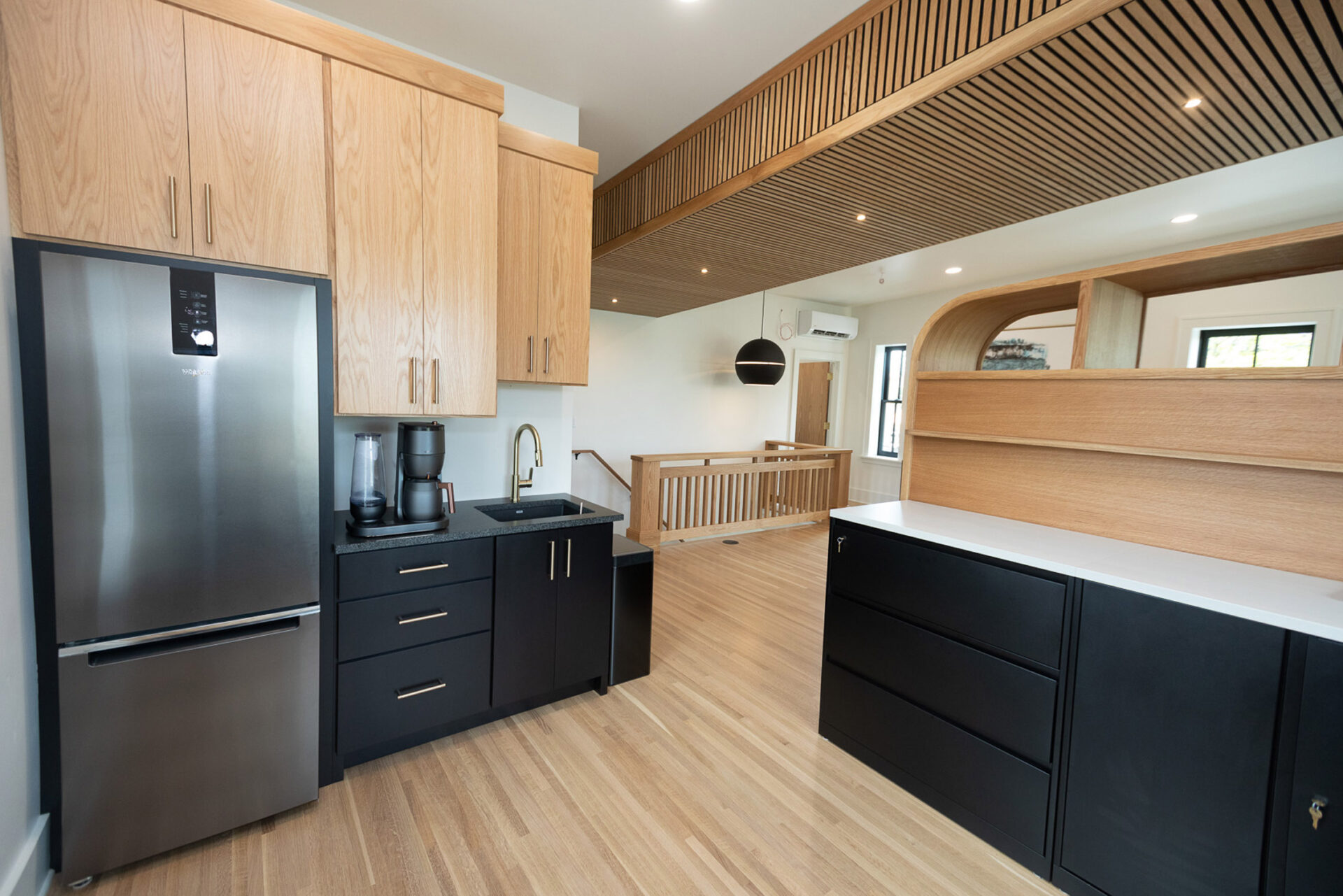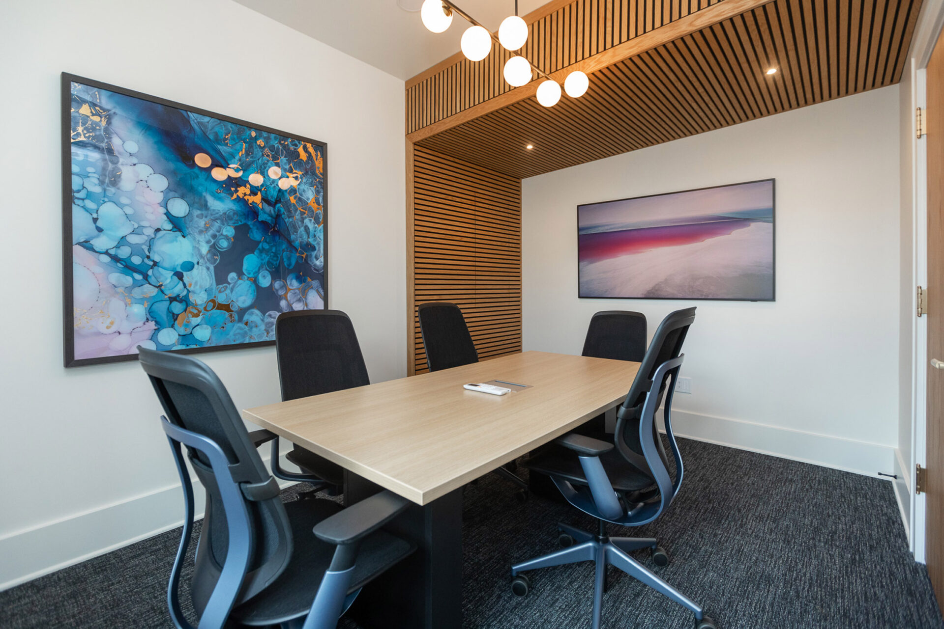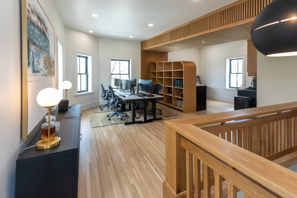 “Our employees reserve a desk and conference space if they want it for the day, but otherwise everybody works from home. So this is a place to meet with clients or if they’re working on a big project and want additional screens and access to a big copy machine.”