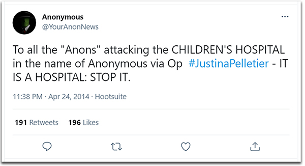 “To all the “Anons” attacking the CHILDREN’s HOSPITAL in the name of Anonymous — IT IS A HOSPITAL: STOP IT.”