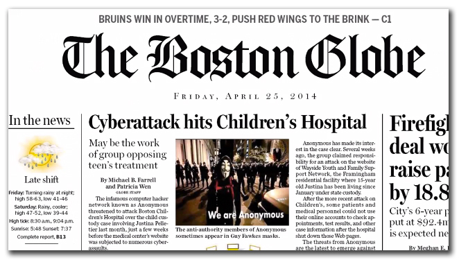 The authorities were now involved and advised the hospital team against talking with the local news because groups such as Anonymous thrive on media attention. However, The Boston Globe’s next headline read “Cyberattack hits Children’s Hospital,” and it all became public knowledge.