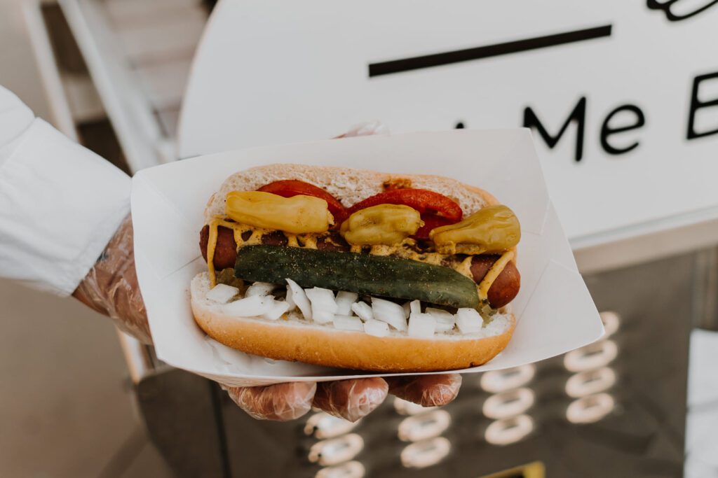 There’s a classic dog with ketchup, mustard and relish; a chili dog with all-beef chili and shredded cheese; and a Chicago dog with seven traditional toppings. Combo meals come with chips and a drink. There’s a kids meal that offers water or juice as an alternative to soda.