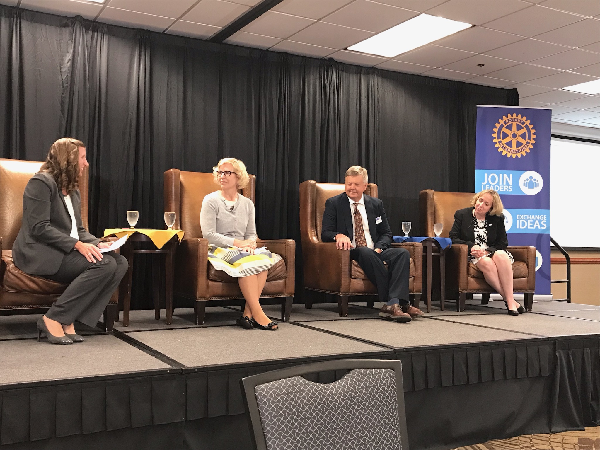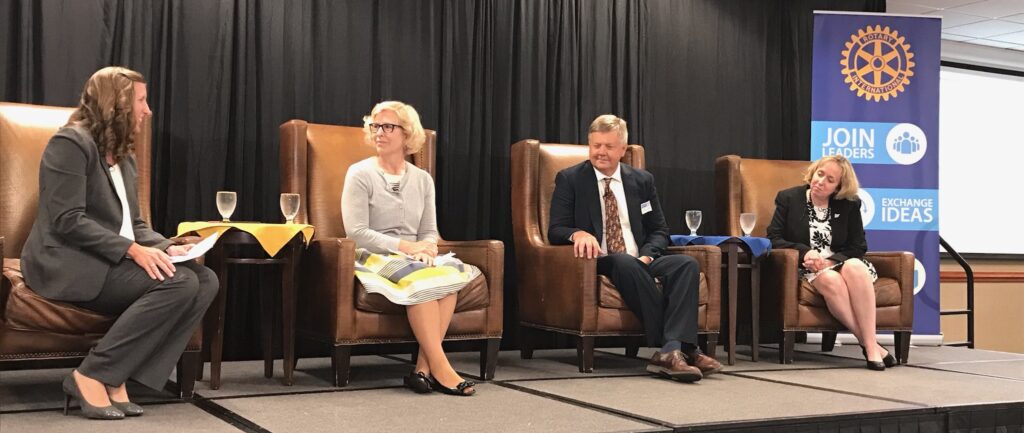 Lindsey Meyers, vice president of public relations at Avera, leads a panel discussion at a recent meeting of the Rotary Club of Downtown Sioux Falls with Kris Gaster, Dr. John Lee and Pam Traxel, senior vice president for the American Cancer Society Cancer Action Network.