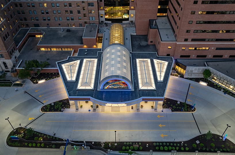 The revitalization of an iconic stained-glass entry canopy in Rochester, Minnesota, creates a more welcoming arrival experience for patients, families and staff, along with more drop-off coverage. Photo credit: Dean Riggott Photography