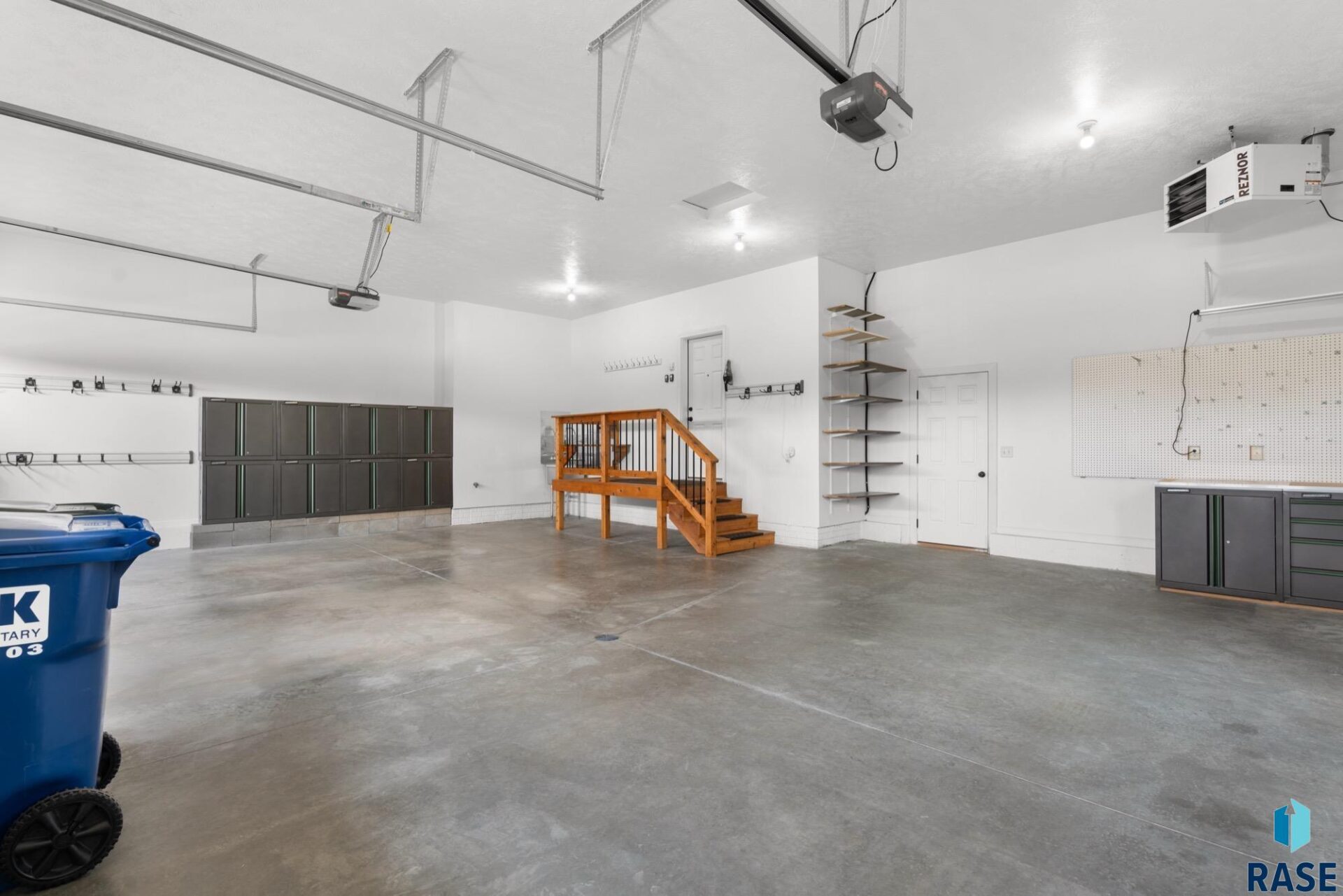 An oversized, heated triple garage includes cabinets, water hookups and drains.