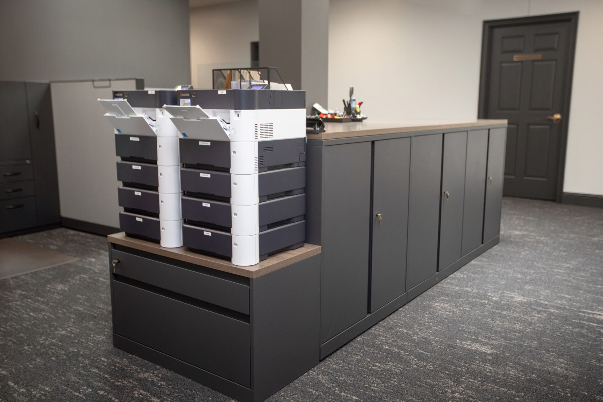 Efficiencies were gained by grouping printers in areas where several people can share them and turning some resulting space into areas for quick meetings or room to spread out.