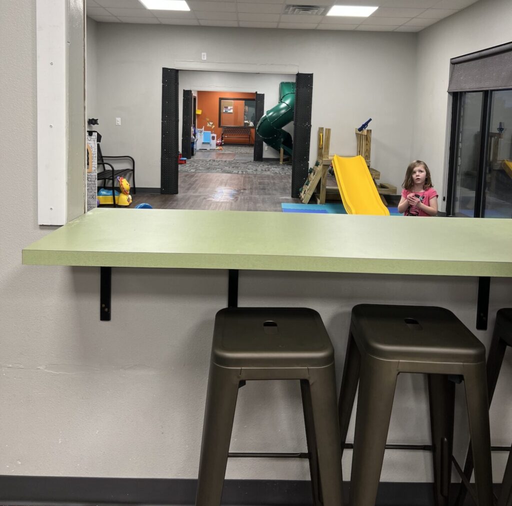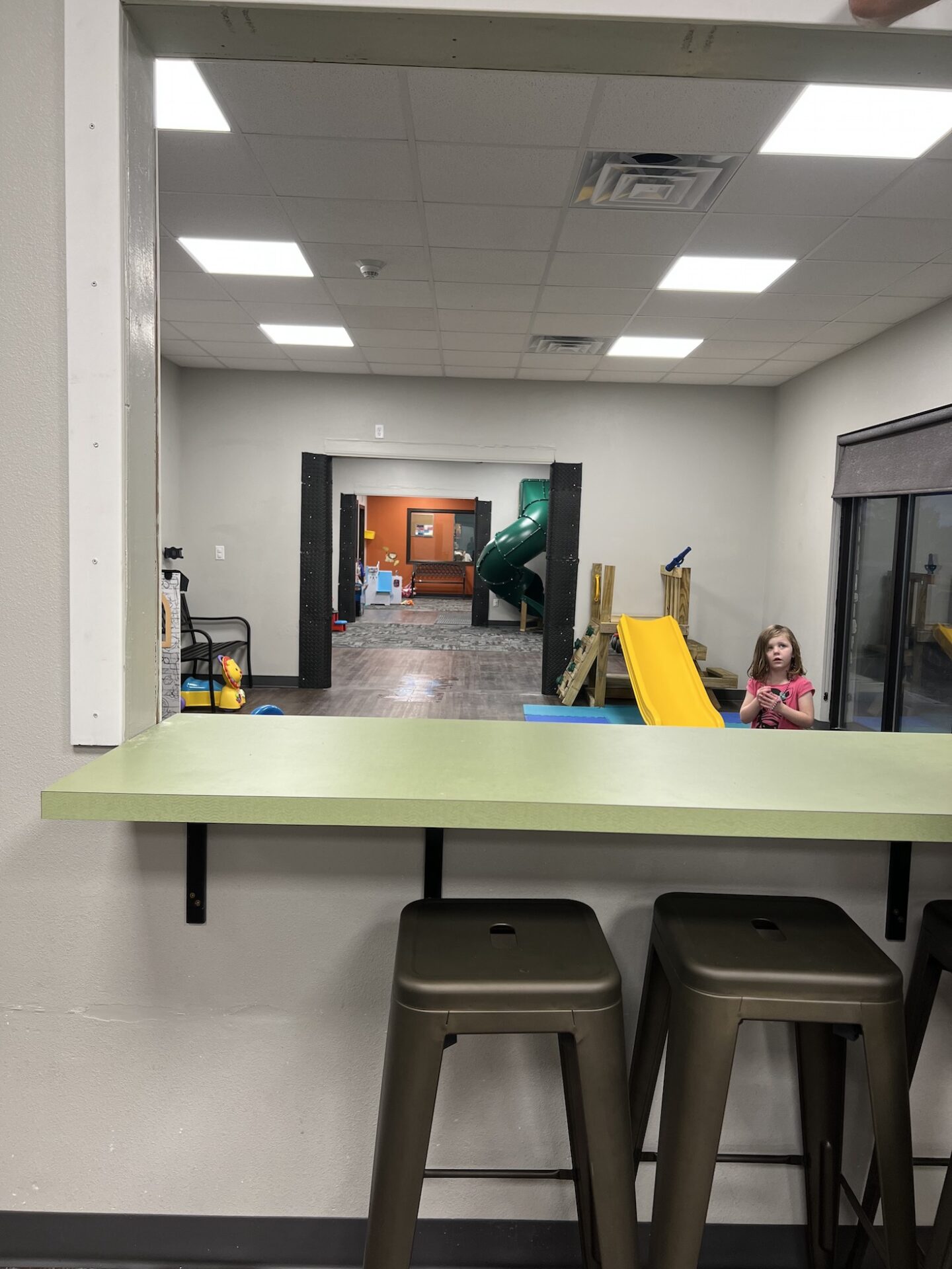 A counter bar top and windows allow parents and caregivers to watch children play in a separate space where they can relax and drink locally provided coffee and drinks.