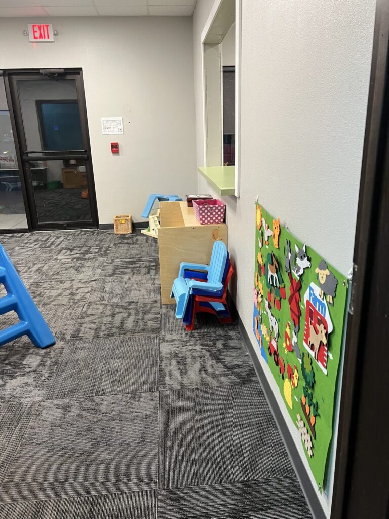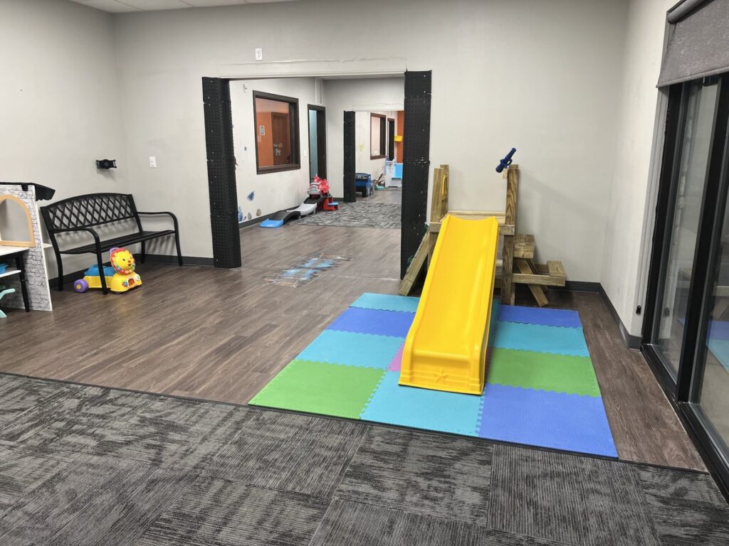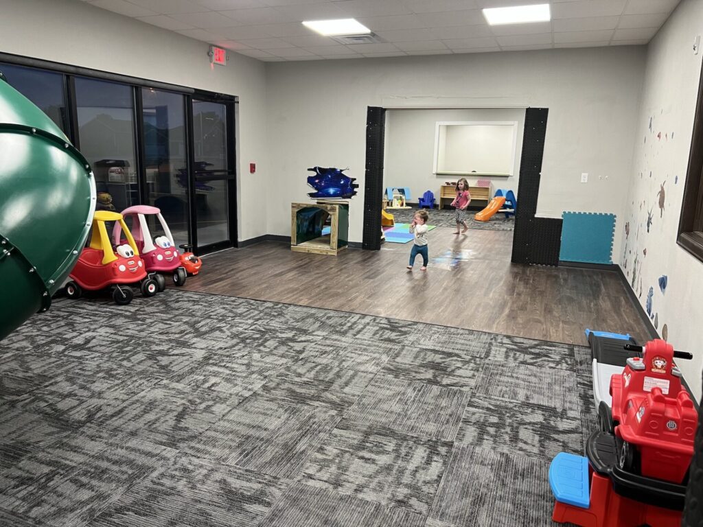 The children’s area is about 1,000 square feet, offering a pretend station, building station, doll house and pizza kitchen area, train table and workbench in addition to the slide and tunnels. There is a gated baby area for waddlers and younger that is about 350 square feet.