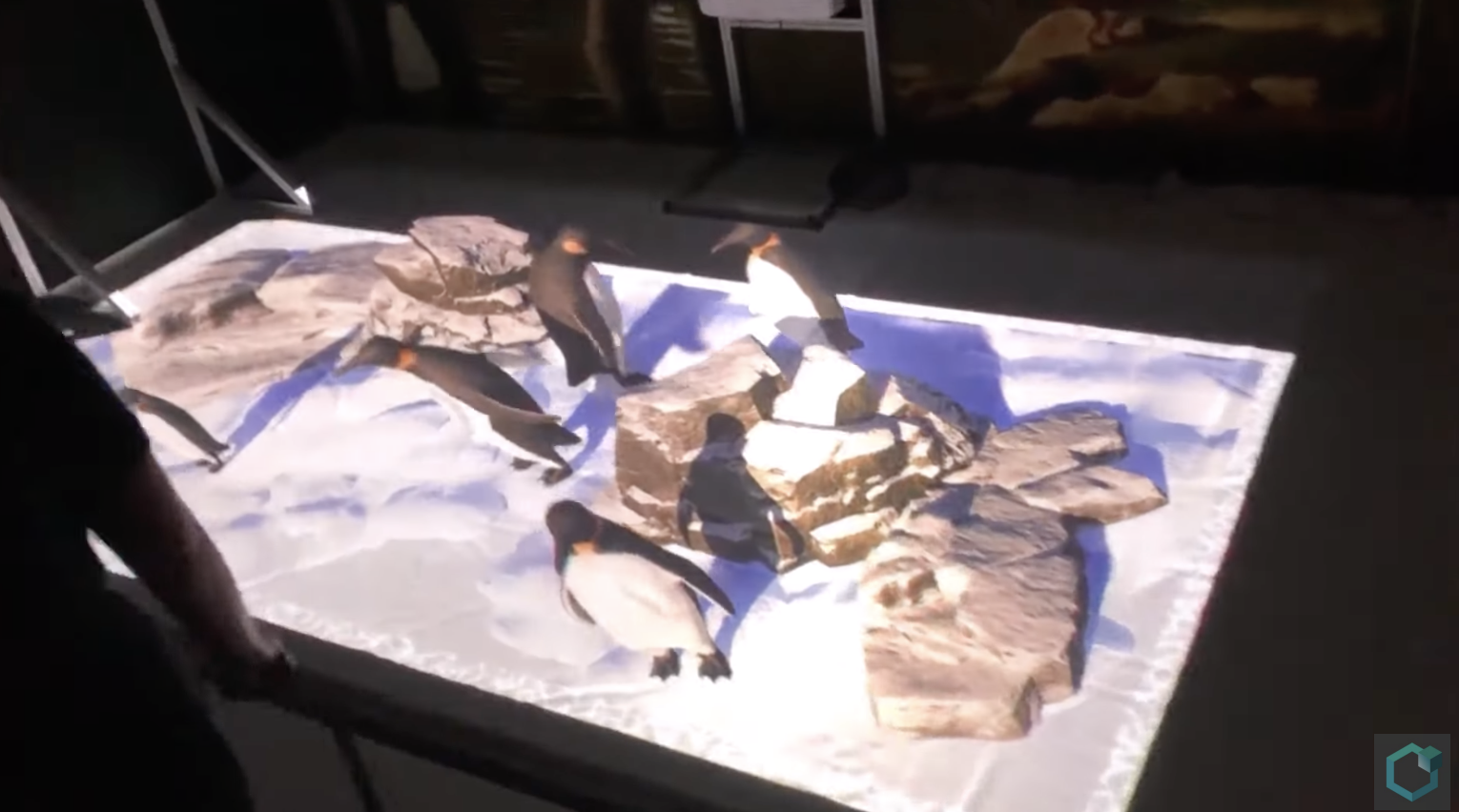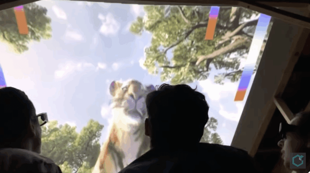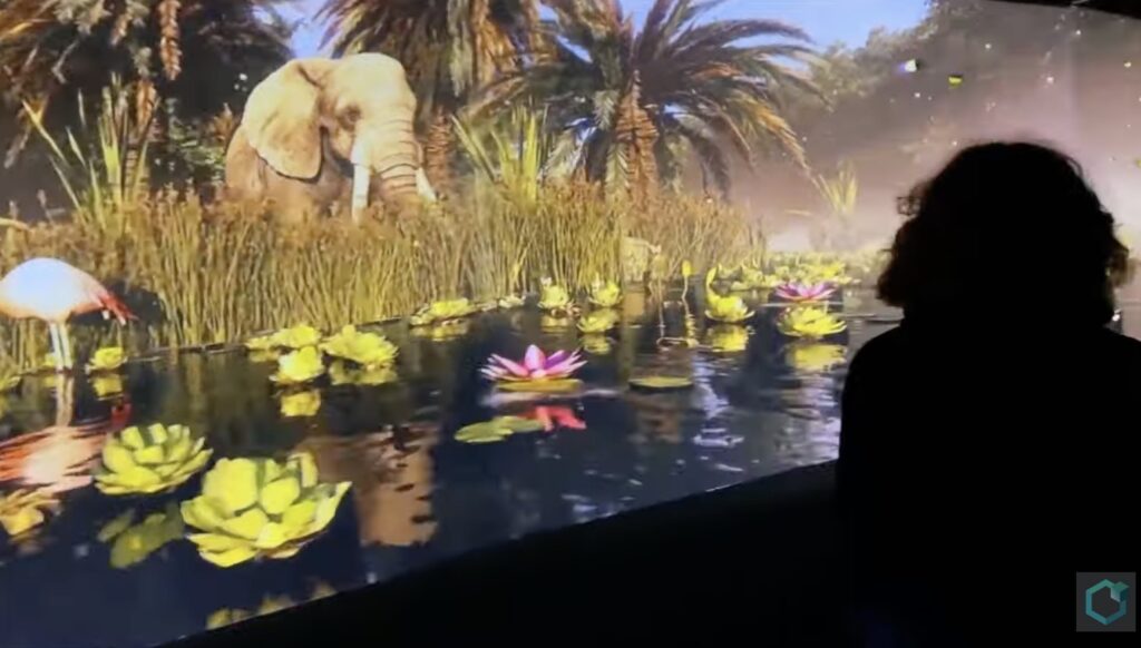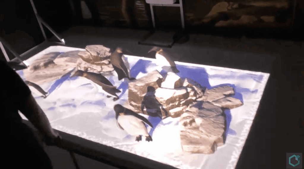 Animals and environments also project off the ground in two enclosures while at times it appears things are floating. In a Christmas experience, for instance, guests see penguins sliding down a hill.