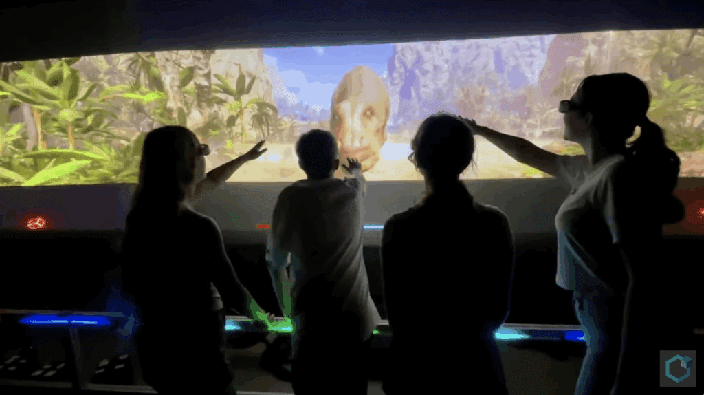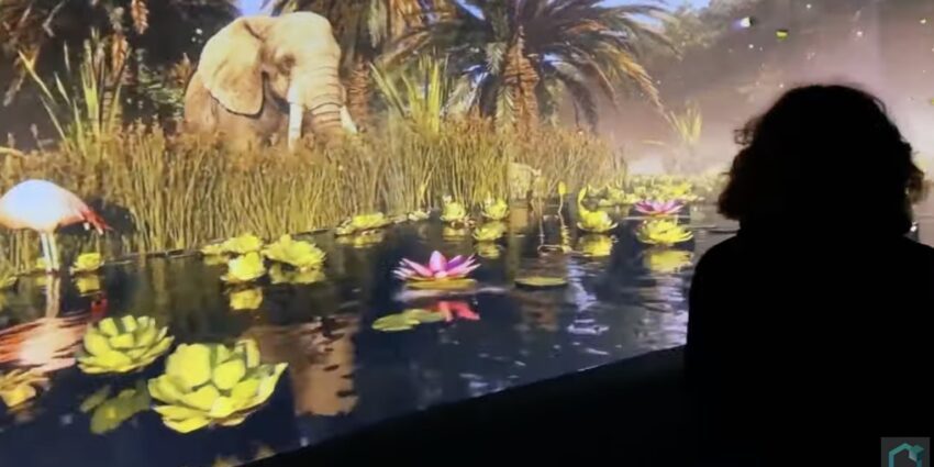 Animals and environments are projected into a 60-foot tunnel and above guests’ heads as they experience virtual cherry blossoms falling around them or a T-Rex attempting to take a chomp.