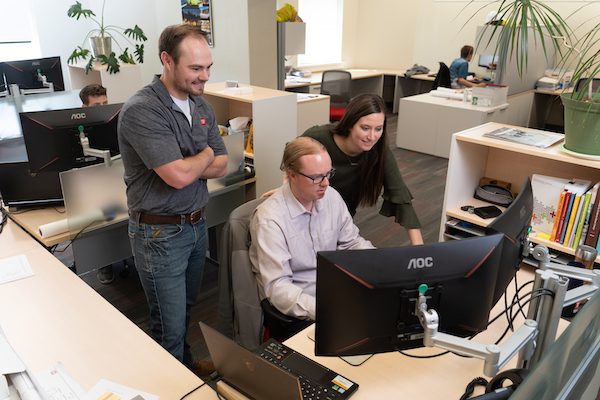 These TSP team members in Rapid City collaborate across disciplines as they work in the business of architecture and engineering. They also work on the business, contributing to TSP’s design direction and operational approach through their involvement in various subgroups. (Left to right) Mechanical engineer Chris Maks is a member of the ESOP Committee, while director of architecture Brian Johnson has a direct line of communication to electrical engineer Kelli Osterloo and her fellow members on the Innovation Team.