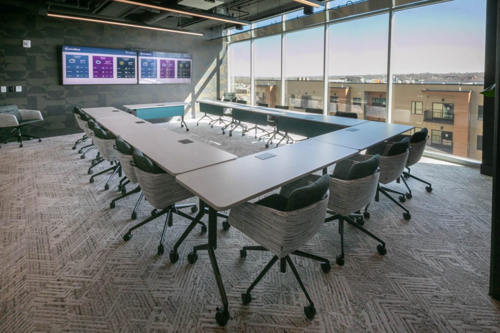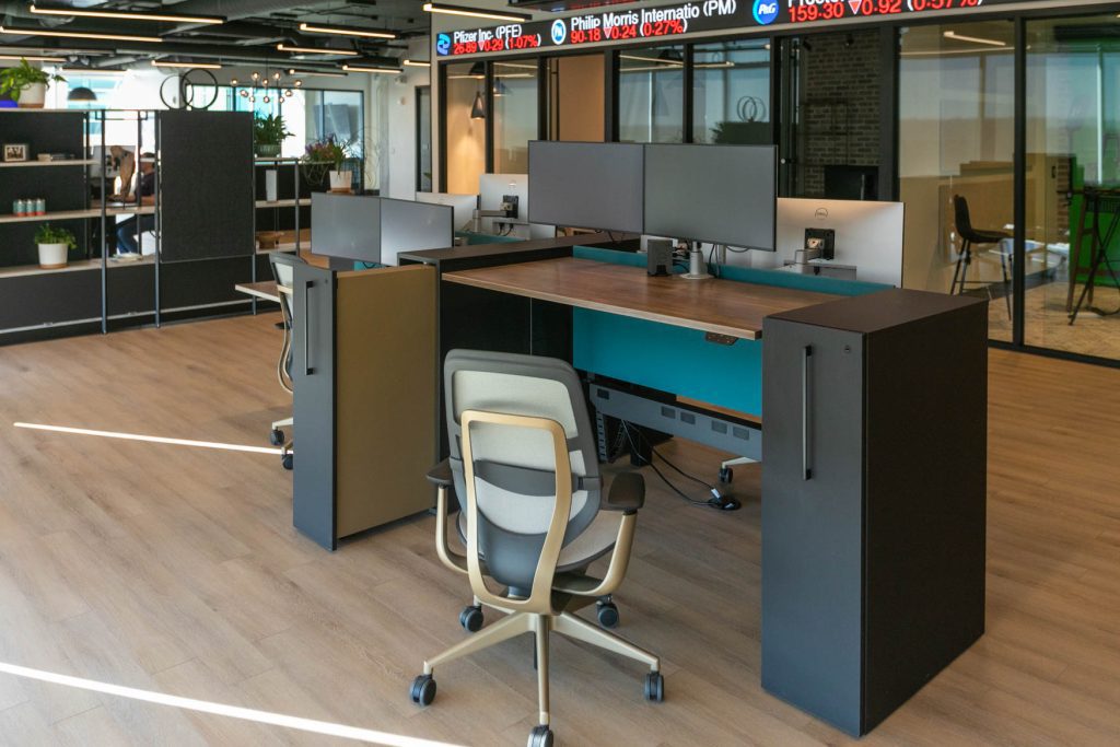 “They have a really sophisticated look but are comfortable. The chairs are paired with flip-top training tables with power, and all the furniture in the space is visually tied together with black bases. MarketBeat’s teal can be found on the modesty panels on the training tables.”