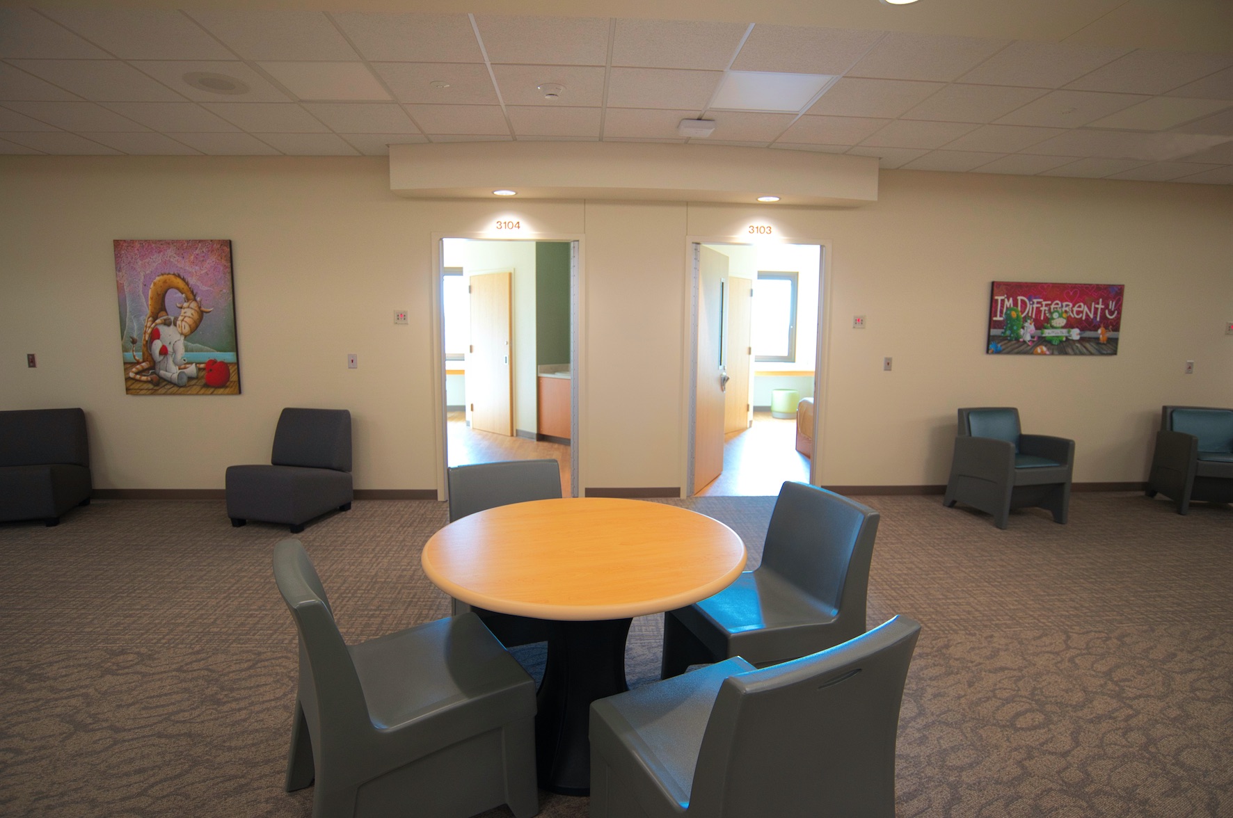 Patient room furnishings vary slightly based on ages, but all the furnishings have a modern look. Most rooms have a built-in desk, and IOP provided desk chairs.