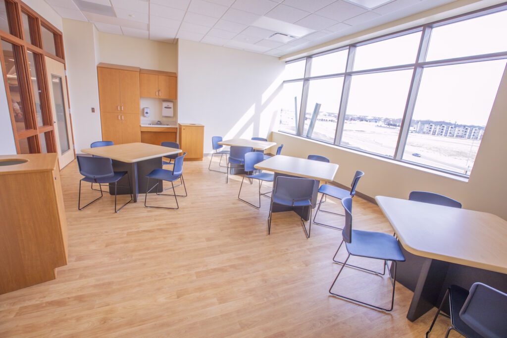 Instead, “there are group rooms, day rooms and dining rooms as the main communal spaces,” Hansen continued. “In the day rooms, we did a mix of tables and lounge seating, and the group rooms are more classroom-style with tables and seating.”