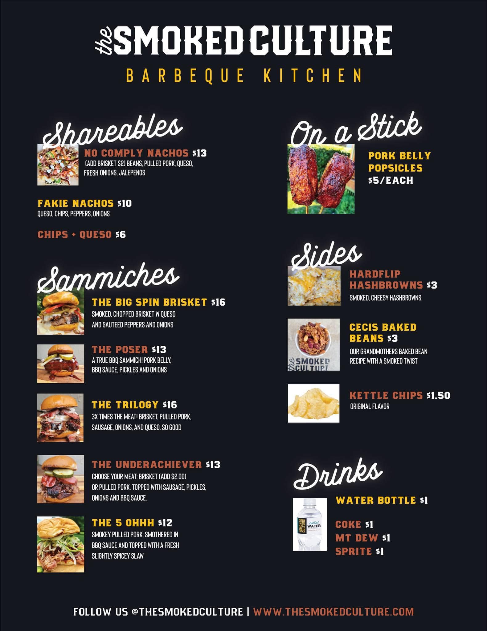 For homemade sides, The Smoked Culture will offer cheesy Hardflip Hasbrowns and Ceci’s Baked Beans, both of which are smoked. The beans are a twist on his grandmother’s recipe.